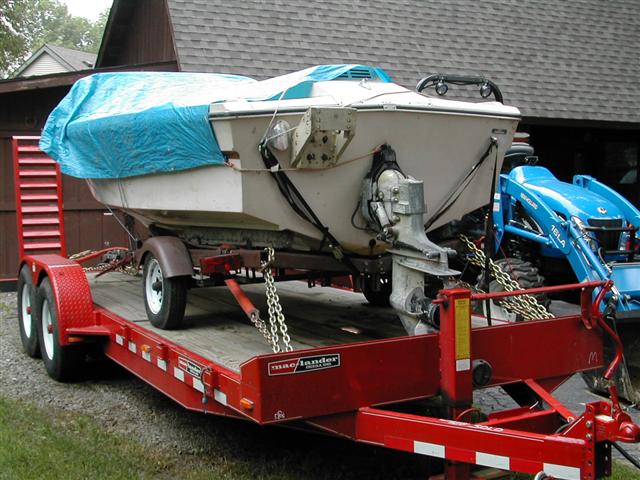 Man, I must be bored today. Sooo, I took a couple photos of the oddest load I've ever hauled. It's a 17' Lonestar 120 I/O. My wife inherited from her Dad. I never trusted the trailer, I don't think it's the right one for the boat, and had a lot of cobbling up done on it. Hence, I'm moving it "upnorth" like this.
