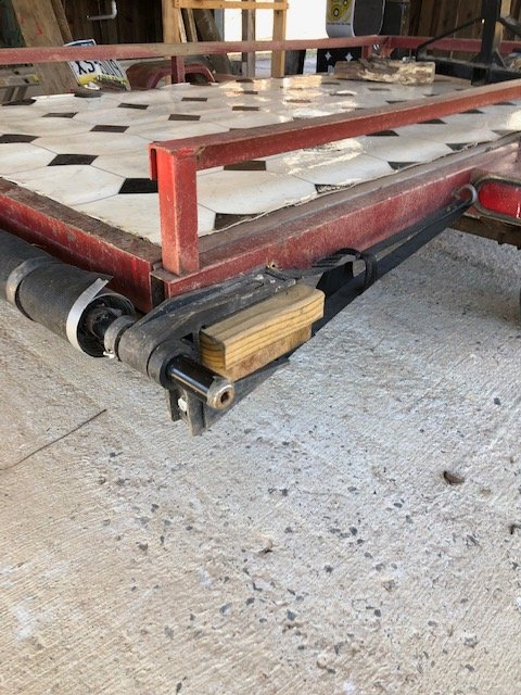 I‘ve mulled this over and have come up with what I hope is a workable, albeit Rube Goldberg style, solution… something akin to a ”truck bed cargo unloader” (this setup won’t work on my trailer as the bed height won’t allow the crank handle to clear the ground)