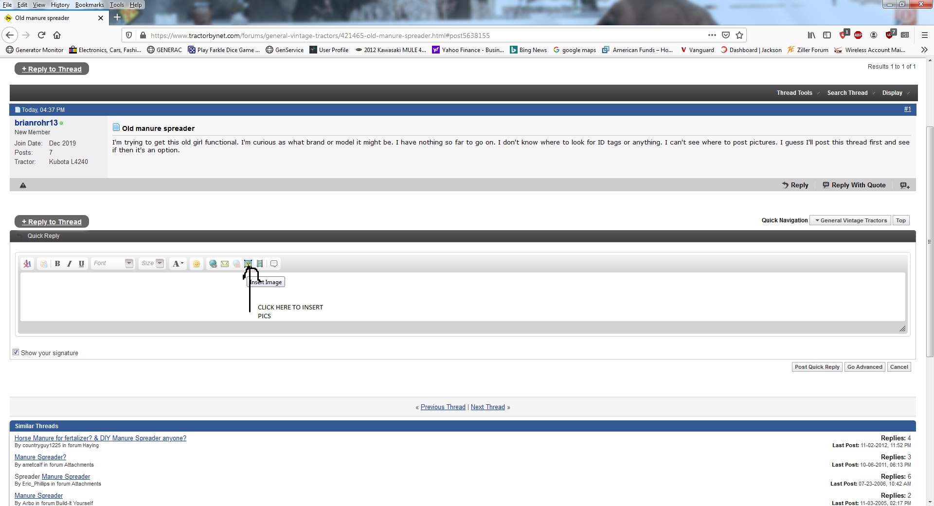 I'm trying to get this old girl functional. I'm curious as what brand or model it might be. I have nothing so far to go on. I don't know where to look for ID tags or anything. I can't see where to post pictures. I guess I'll post this thread first and see if then it's an option.