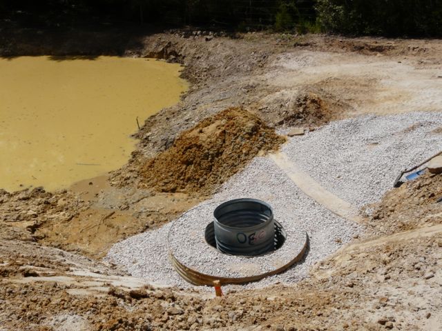 Pictures of the installed culvert. The spring water is coming in now around the culvert where the gravel was placed. When that gets clogged up it will come out the culvert which is 1" below the water level (well, that's the plan anyway). The part you see sticking out is the connecting piece with a screen on top to keep animals from falling in the 6' by 30" culvert.