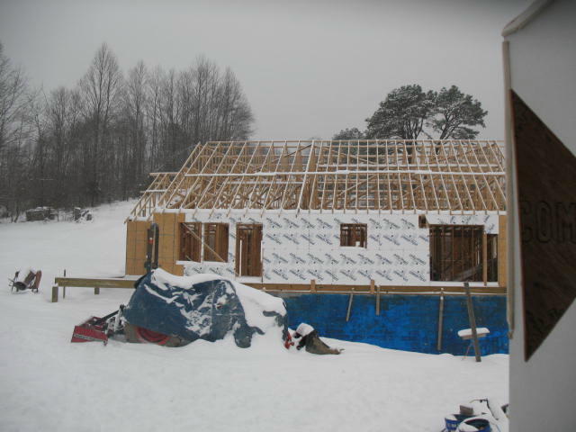 The metal roof goes on. FINALLY. I guess I shovelled snow off the floor of the house 12 times this winter! For those interested, the color we went with is called Antique Bronze.