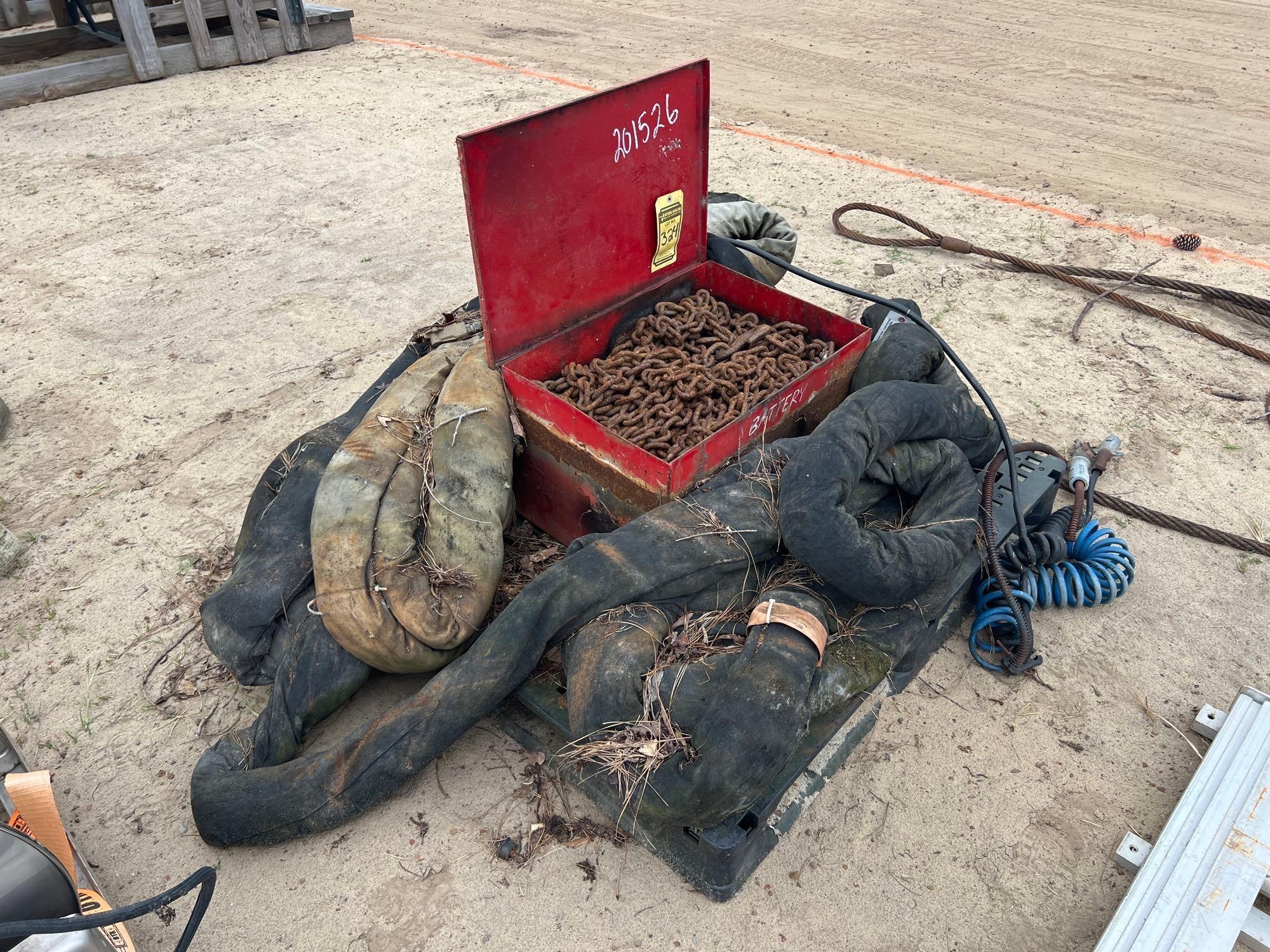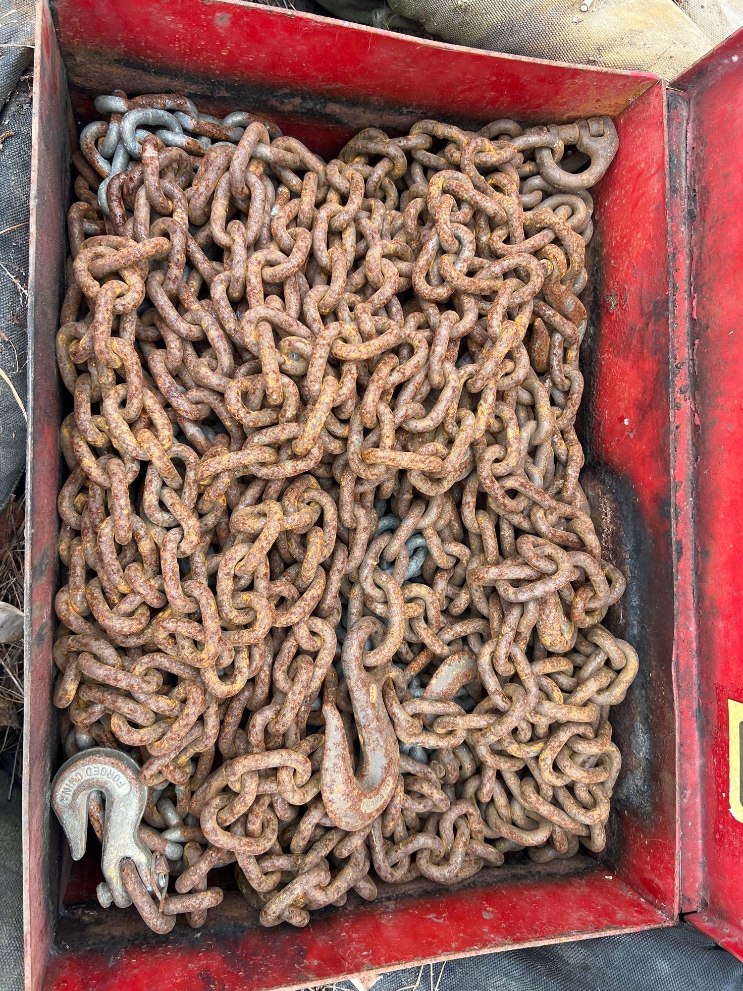 PALLET OF NYLON SLINGS, METAL TOOLBOX W/ CHAINS
