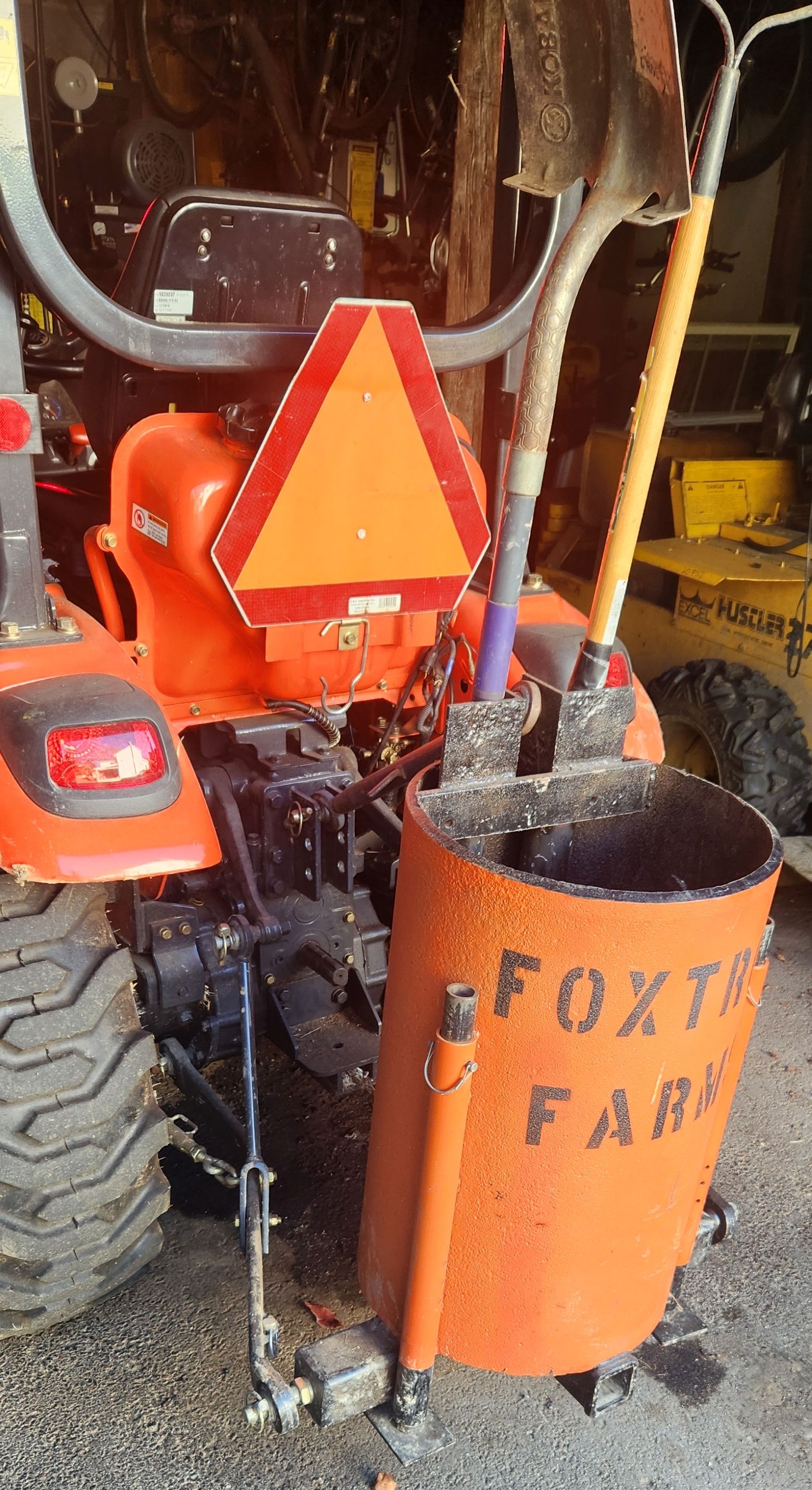 I stores rakes and shovels in 2 vertical pipes mounted next to the 3-pt.’s top link. I leave the ball hitch and a toolbox inside the pipe all the time. There’s room for a 5-gal bucket inside the pipe to carry smaller items.