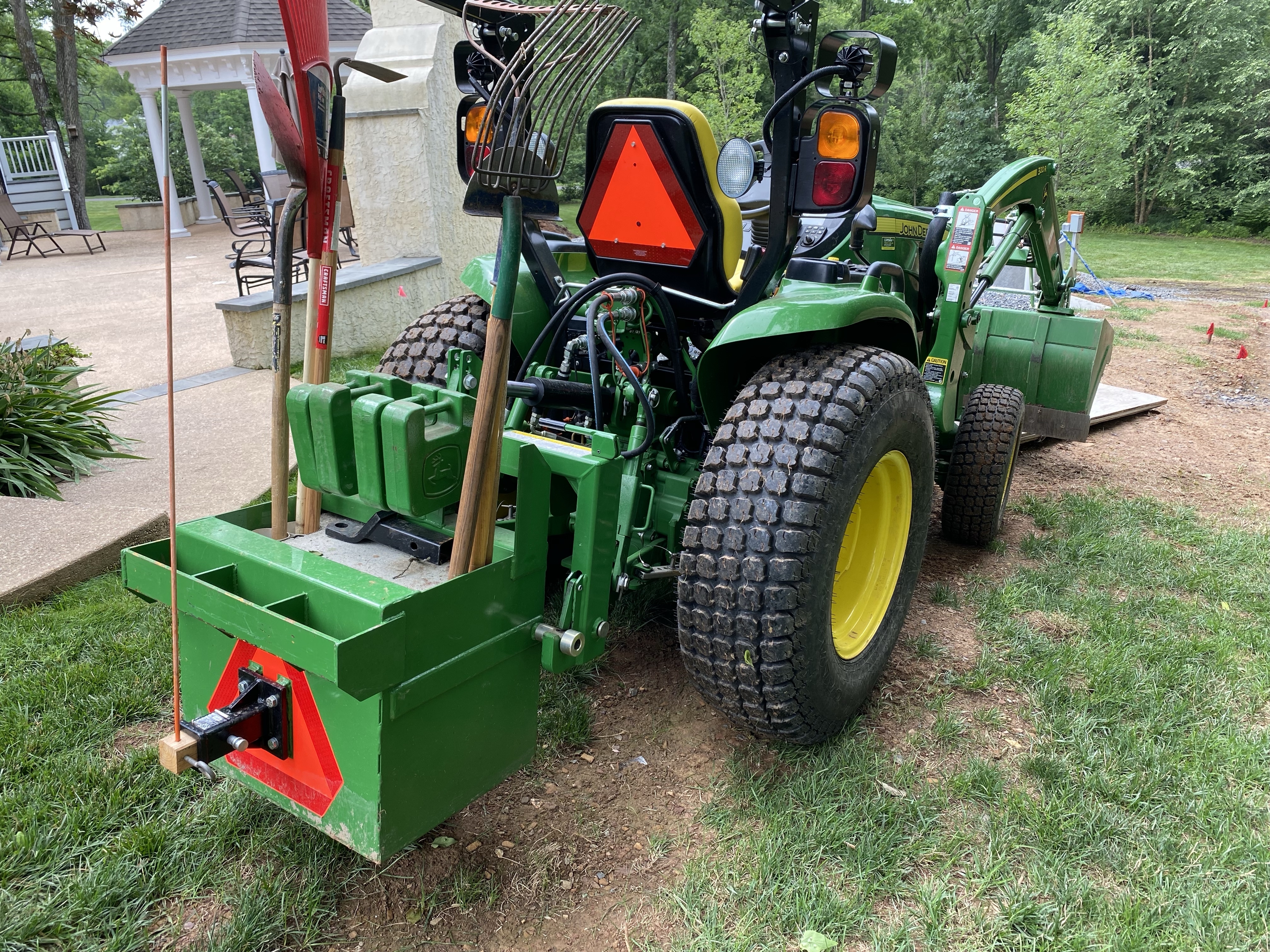 I took a standard 750 lb. ballast box, sunk four 3" PVC tubes into it to hold shovels and rakes before filling it with concrete, and added some weight-hanging bars to it so that I could add suitcase weights up to 1500 lb. I also left some space in the top tray to add chains, not so much for weight although they have that bonus effect, but because I often need chains.