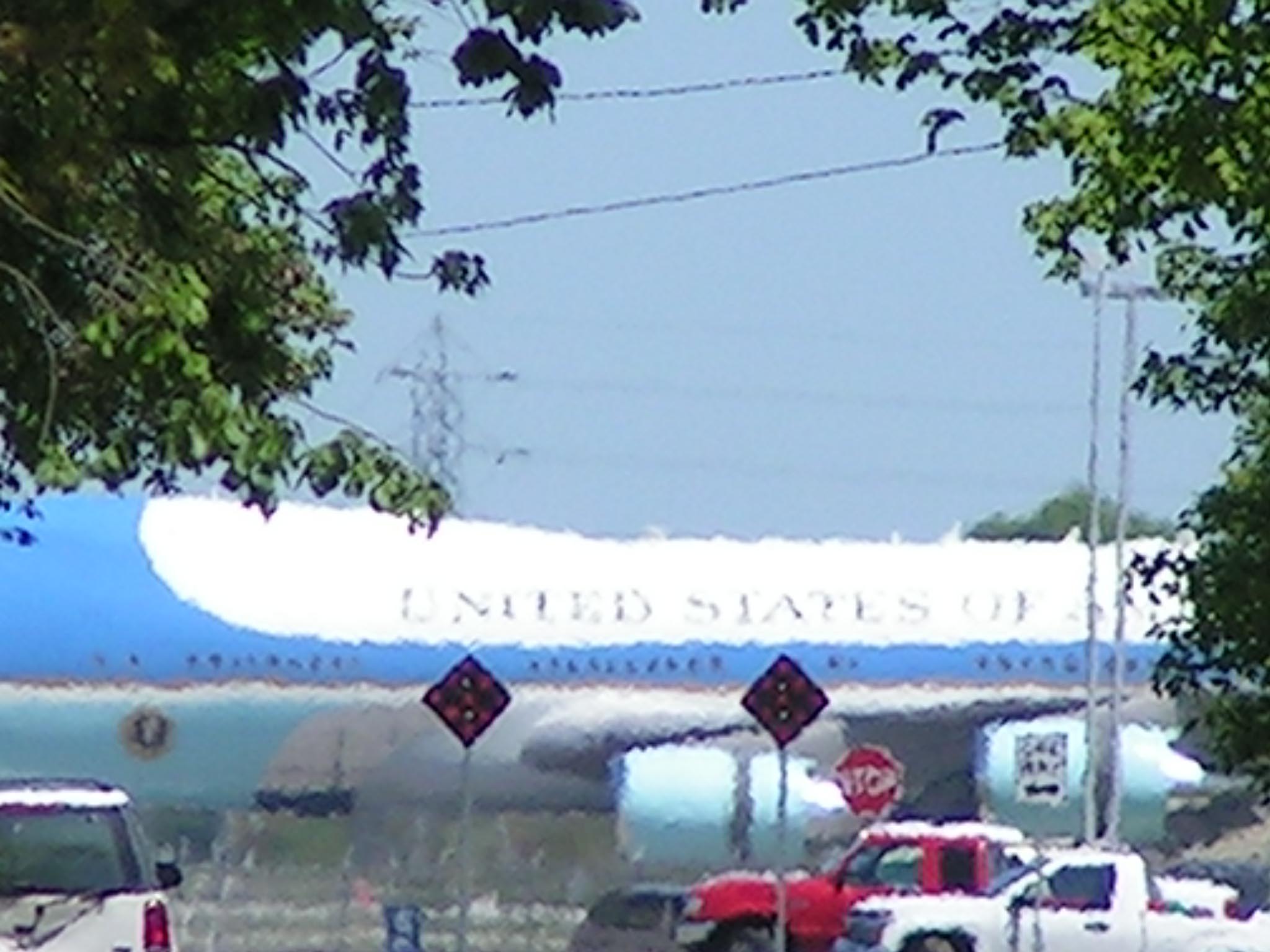 Air Force 1 landing on runway 27L in South Bend, Indiana, then taxiing back east to the terminal. The photos have a lot of heat distortion, as it is a tad over a mile away.