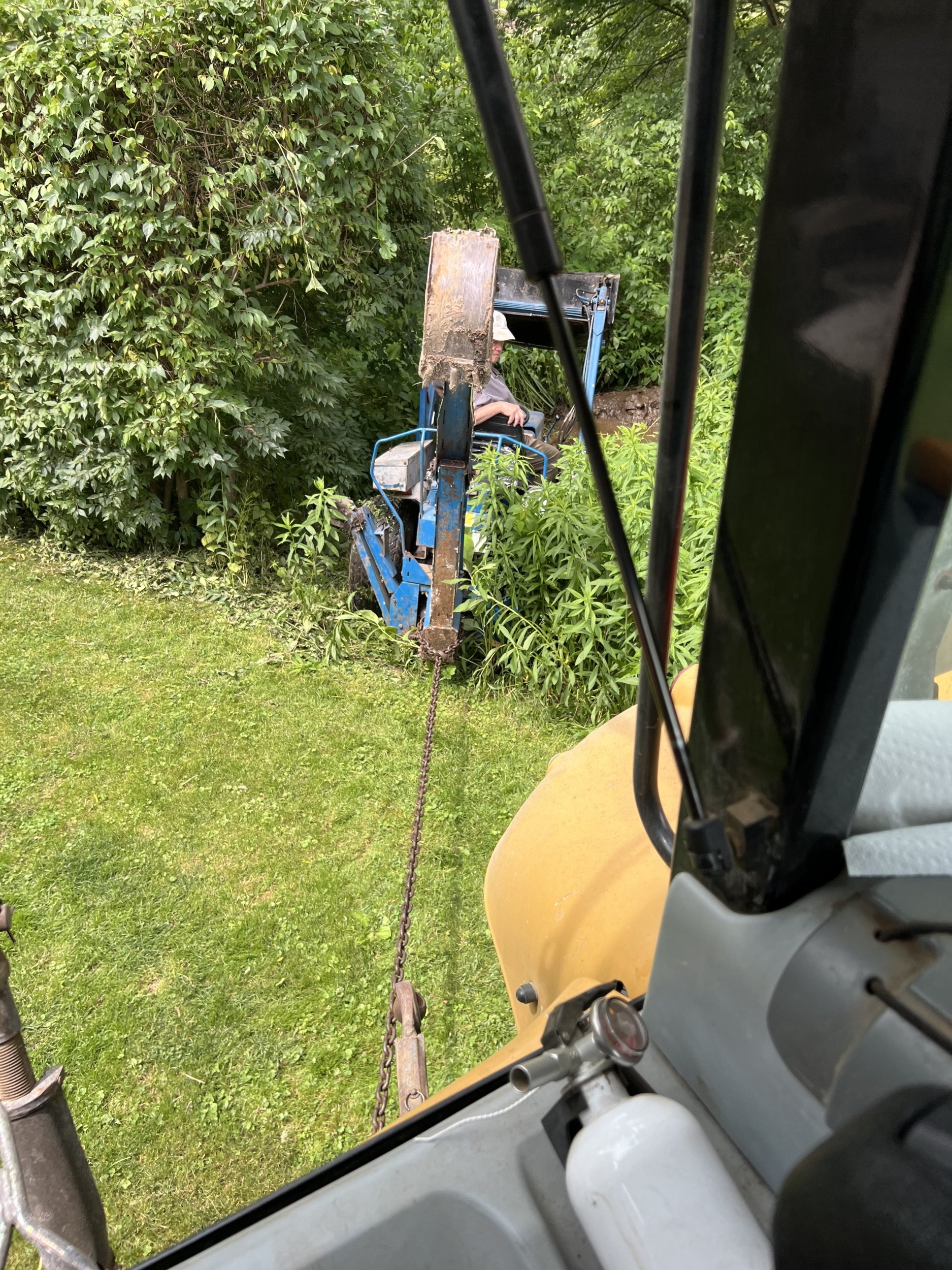 JD. 5103 2wd. I came real close to getting it stuck. Mud hole and Trees. Fel. so I was able to bucket it out. But The worst was a Rental Bobcat. They just came available. That one with wheels not tracks. Wet mud hole!!. It was deep like the Prev. Pics. Knew it when I lost traction and dumbed that bucket load quick!!! Took me a few Hrs. to get that one out. Another reason the Rice Patty Yanmar comes in handy. The Org. Bridgestones. The Lugs are Huge. My lawn mower though