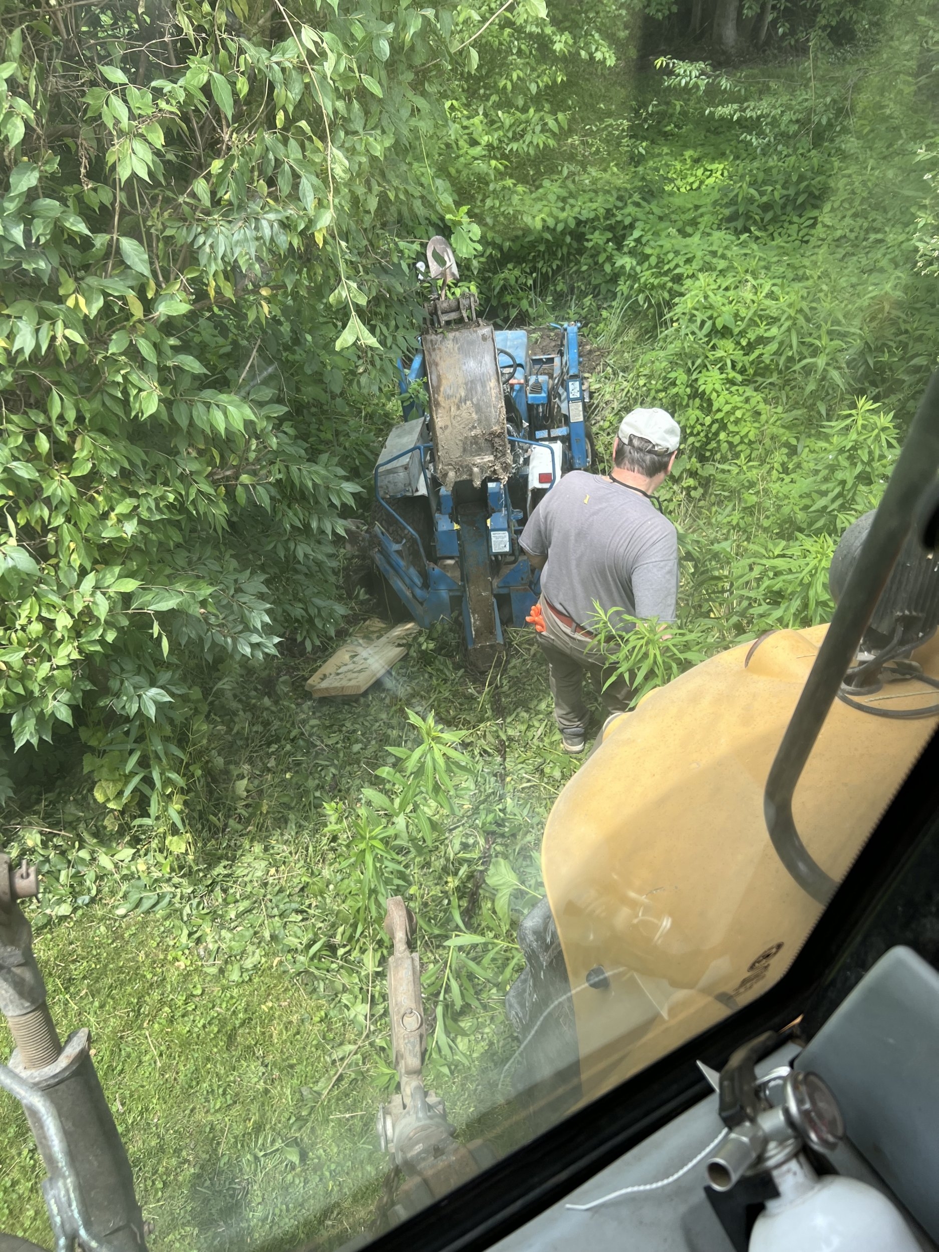 I was at a bad angle and couldn't dump the load. I tried pulling it out with my backhoe, but it was too heavy. My neighbor also has a backhoe, so parked it beside mine, and we where both able to pull it out.