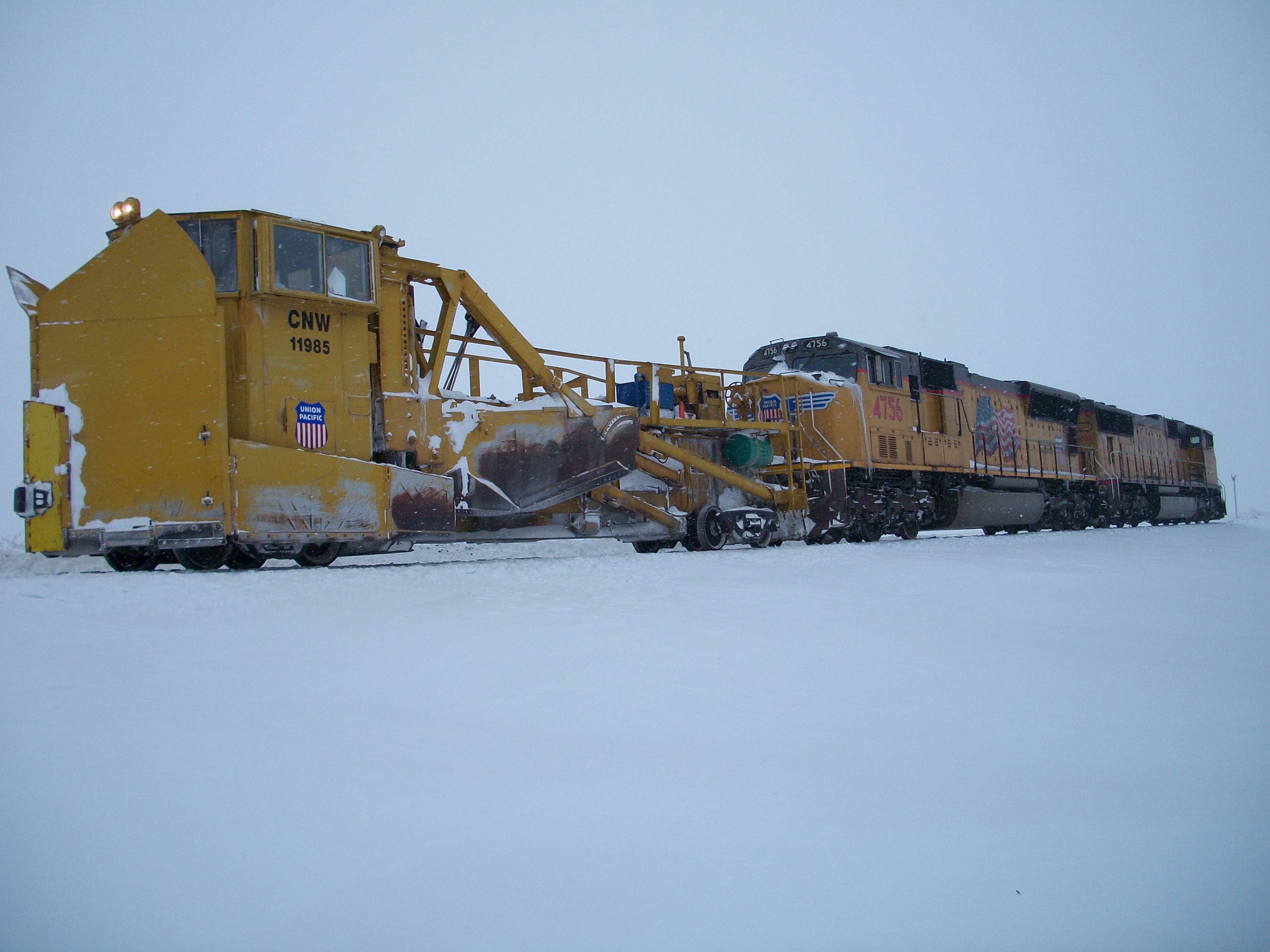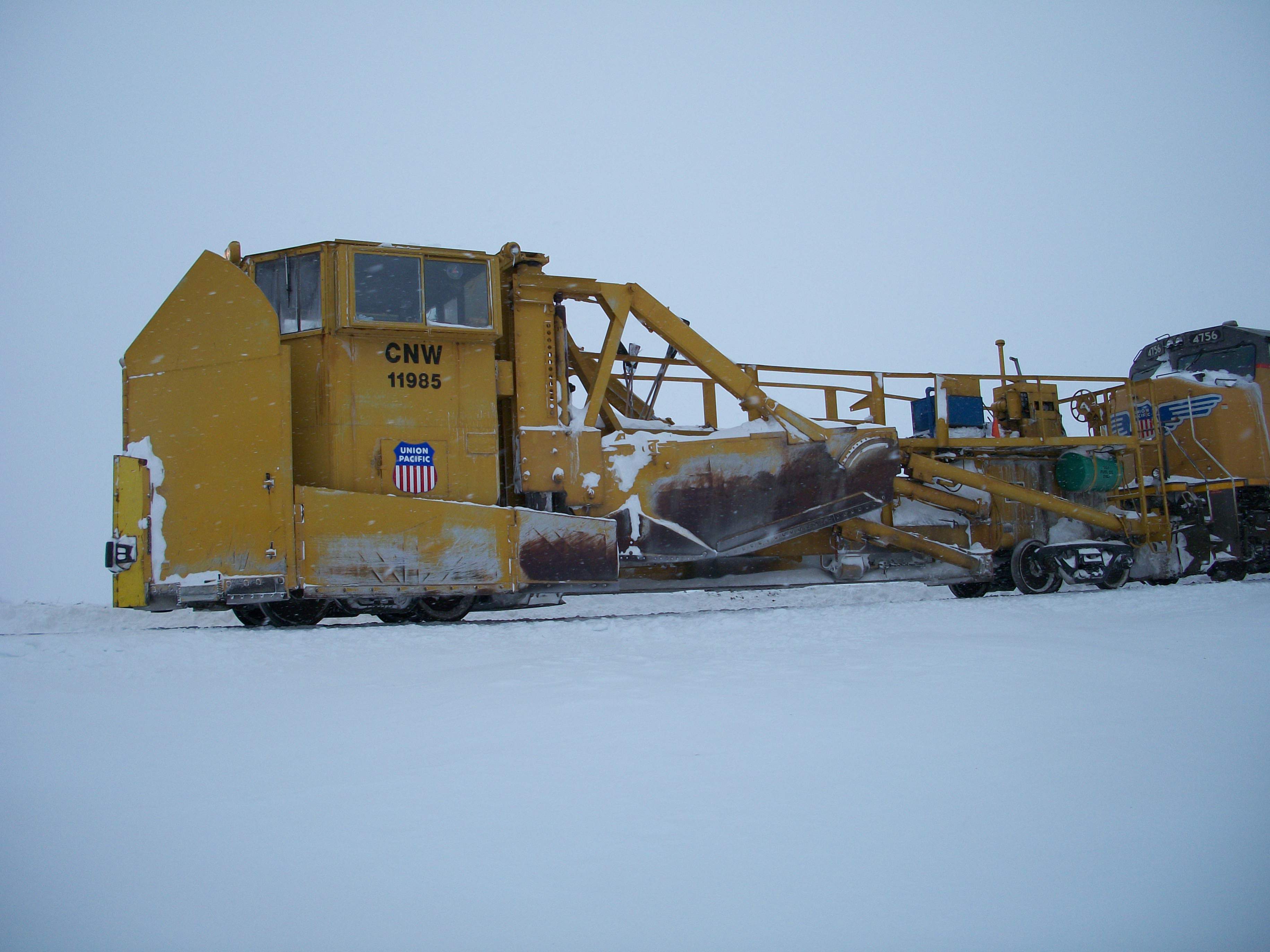 This is our snow fighting weapon at work. Its called a Jordan Spreader. The nose blade lowers down and each side wing swings out, so you end up with a 20' wide plow. The spreader takes 3 guys to operate the hydraulics, a conductor , and an engineer to push it. The two locomotive put out 8800 HP and believe me it takes all that too get through some deep drifts. As an engineer people ask me whats it like, I say you cant see anything most of the time! Its a white knuckle ride and not much fun!
