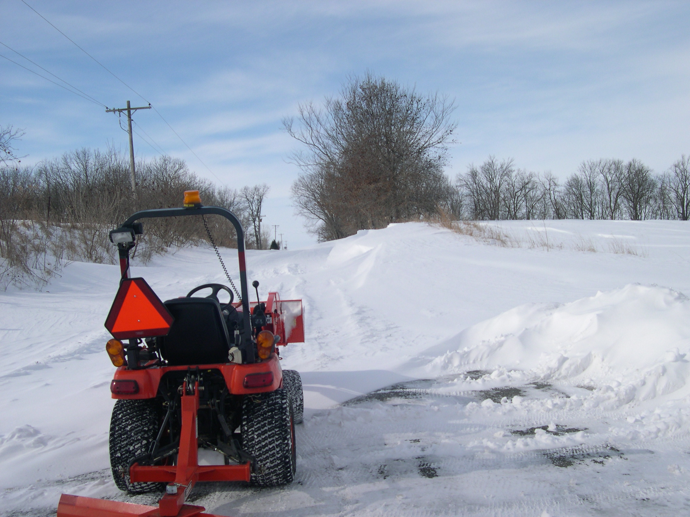 Here is a picture of my BX2350 clearing the road in front of my house from a snow storm we had a couple of years ago. Some of the drifts were over 3 feet deep, and the rear blade was pretty useless, the end loader did all the work.