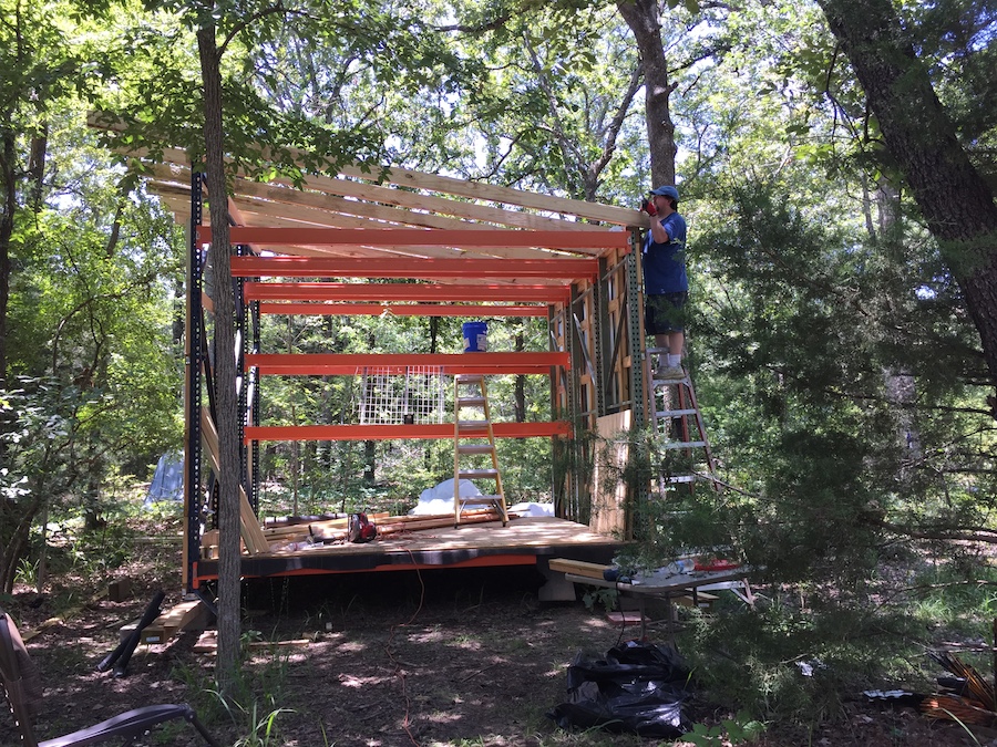 I put my grapple on that lower shelf by setting it on a pallet and using the forks to place it there. There is only a couple inches extra headroom to fit it in, so watch that as it would be nice to have a bit more wiggle room. Keep in mind that if you don't have really good access, you are not going to place multiple things on the same shelf with a tractor as you probably won't be able to maneuver enough to come straight in. i considered just placing it directly on the shelf and then unhooking the quick hitch, but quickly discarded that idea as crazy. Too easy to screw something up and make it all come crashing down. The forks are only holding it with gravity so much less risk of causing havoc, but i am still very careful when doing this.