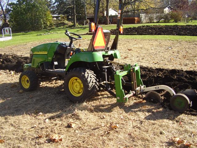 Here are some plowing pics. I bought a used 12 inch Brinly plow but it had a category 0 hitch. JD still has in stock the cat 1 mast to fit this plow but it was way too much money so I made my own to fit the I-match. This makes it easy on and off and just a few seconds to adjust the right lift arm and top link. I was plowing 6 to 8 inches deep in this garden in low gear at 2300 RPM and never had a problem. I never knew plowing was so much fun!
