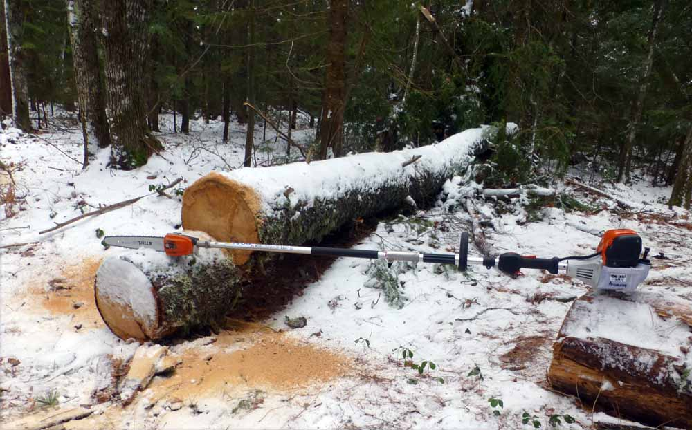 My EGO pole saw, with the extension, can reach somewhere between 11 and 13 feet, but it's pretty unwieldy. I use it for delimbing branches, that's all. Once the branch is down, the chainsaw does the work