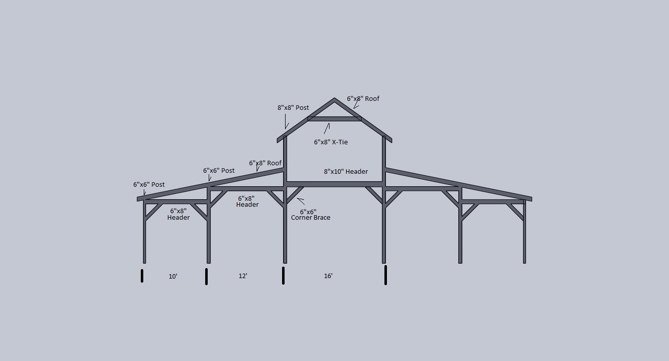 Hey guys I have been gathering some info from resources online and trying to get an idea of what I want for a monitor style barn. I drew up a quick diagram with sizes that I am looking for help on. The 10' width will be open "lean-to's", with the 12' sections being stalls on one side and storage on the other and then obviously a 16' open center.