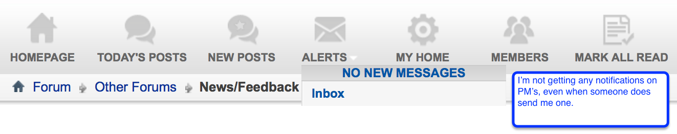 When I clicked onto "Alerts", showed no new messages. When I clicked onto "Home", I saw your PM.