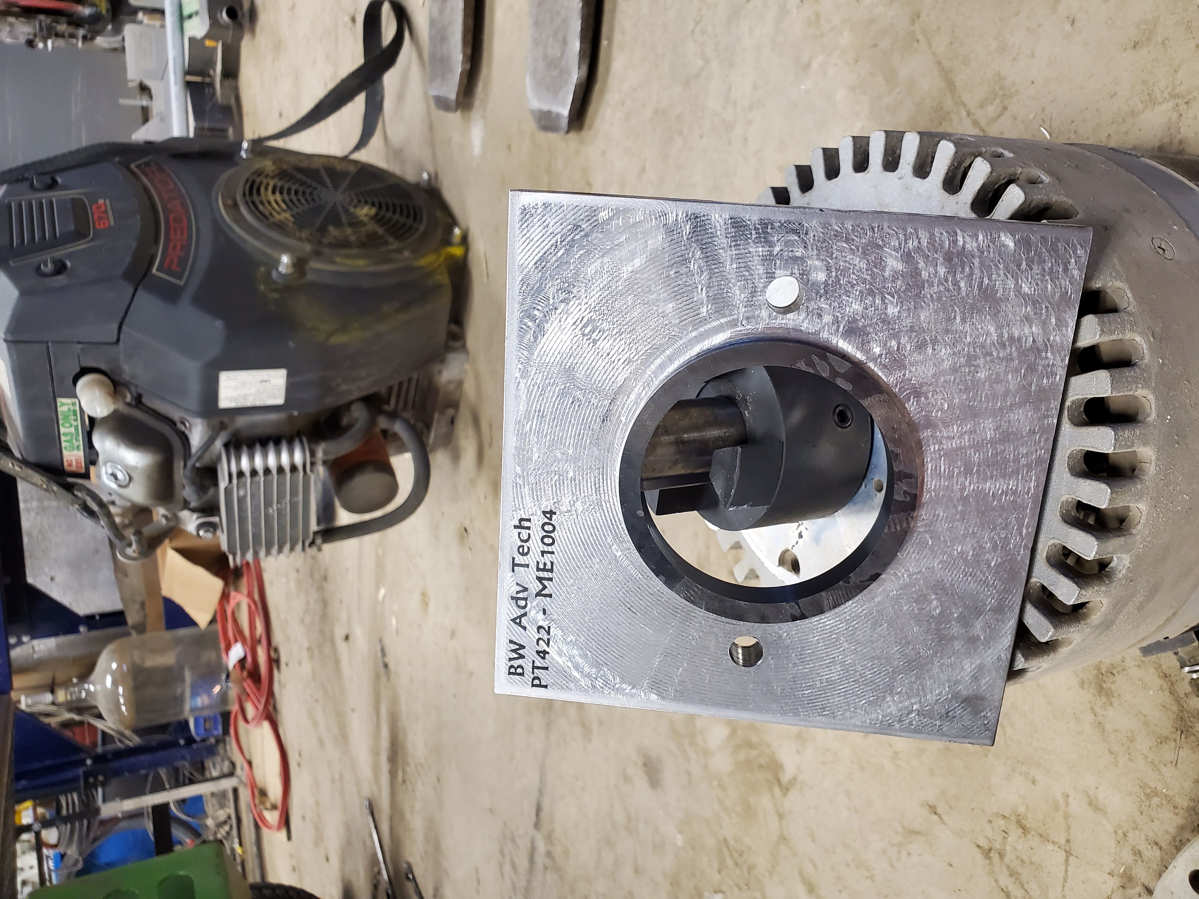 I had some electric drive components that never got used for another project, so I decided to put them into the 422. I replaced the HF engine with a ME1004 motor which has very comparable specs, 21HP peak, 8.5HP continuous, 3700RPM no load RPM, 3100 full power RPM. I paired this with a 400A brushed motor controller. I CNC machines an adapter to mount the new motor to an off the shelf pump mount which attaches to the original PT pump stack.