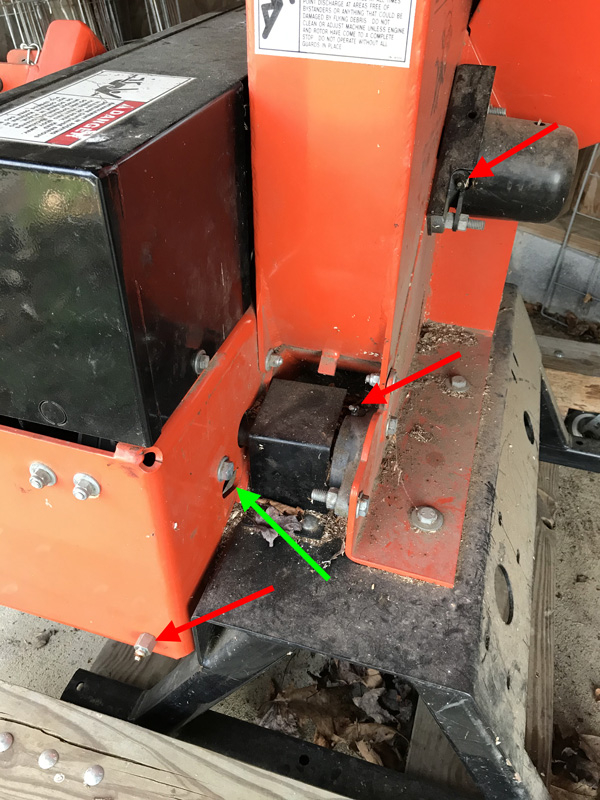 The two upper red arrows point to the zerks on the rear of the flywheel shaft and the jack shaft. I mis-remembered last night, it's the rear jack shaft bearing that easy, and the front one that's difficult. The green arrow points to the hole you are supposed to use to access the front bearing zerk. The lower red arrow points to my relocated zerk for that bearing.