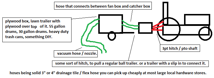maybe a carry-all. to hold the vacuum fan that connects to PTO shaft and 3pt hitch on tractor. then a ball / hitch with a hose added to carry-all. to make your own size toe able catcher box.