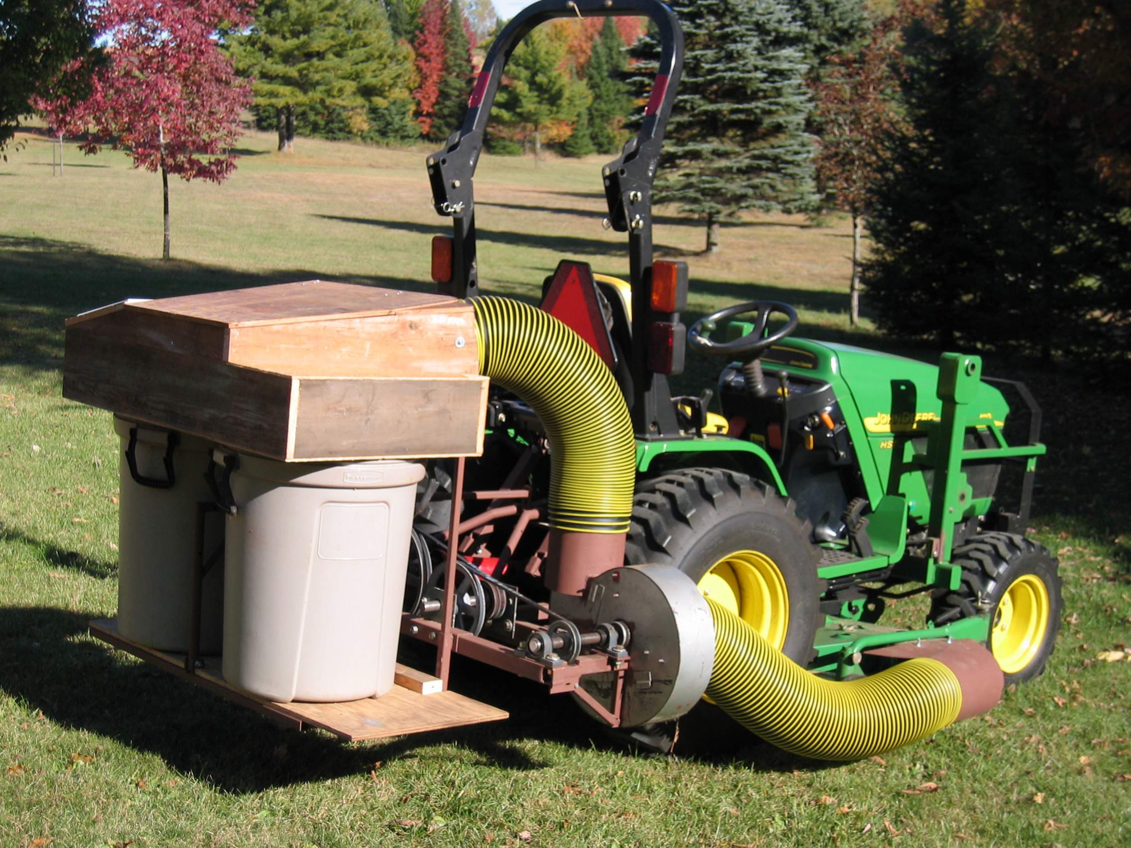Had the trailer model... Didn't like the way it moved around obstructions. I only use a vacuum in fall for the pine needles that blanket the lawn. I built this PTO version which works great and costs only 150.00 for parts. Why someone would spend thousands for the same result baffles me. A larger storage container would probably be the only improvement but it cuts the needles so fine they pack quite well. The containers are heavy but easily managed to dump in a trailer or waste area. A fun project with great results, well worth the time.