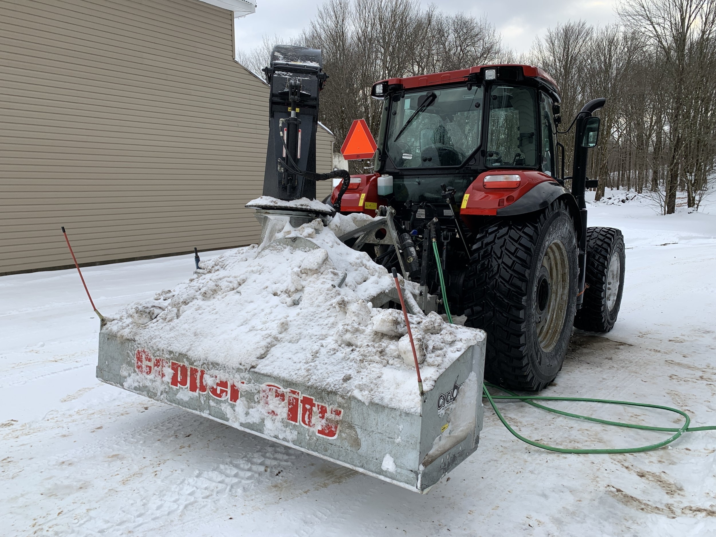 I have run front mounts and they certainly have their place. I like being able to take my blower off and hook to a trailer or whatever and be back to snow in 15 minutes. I do not run a loader with the inverted as it makes me too long for doing driveways but I could if I wanted to. The problem I had with front mounts is they always left that pile of snow wherever I finished. This would not work in a commercial setting. The inverted blower you back up to the garage door and head to the road leaving no residual on either end. This is with the Cyclone style. Yes, I do look back. I am more comfortable getting close to clients doors as I am looking right down at the blower. If I was off the front my tractor is too long for my old eyes to tell exactly where I am. Having to look back is the only downfall for me. I blow with the storm so depth is not an issue. I do agree that front mount has their place just not for me. Looking back is not a big deal.Not sure where I posted my location, but that's alright. Just a few miles from Wrenshall. Anyway, you prefer the front end blower. I have thought about that. I have the midpoint PTO for it, but from what I have heard mounting and dismounting is not particularly quick and easy and I will want to use my bucket and grapple throughout the winter so tying up the FEL with a blower all winter is not high on my list.