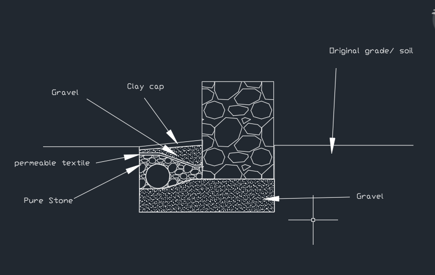 Instead of the slotted corrugated drain I use rigid PVC drain pipe with the drilled holes. Put down geotextile into the ditch, then some clean gravel, and then the PVC. Fold the geotextile over the PVC and backfill..... that way makes a better drain.