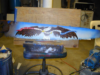 I've done afew garage doors. Cleaning with TSP, dry, then use a scotch brite pad (lightly scuffs) the textured surface, then paint. Speaking of painting, here is one 3/4 done . Last year and this year I decided to air brush a mural and enter it in the Woodstock fair. Last year was a small table with the scene out my front door. This is a cross buck saw blade, (about 75 yrs old) with the Eagle.