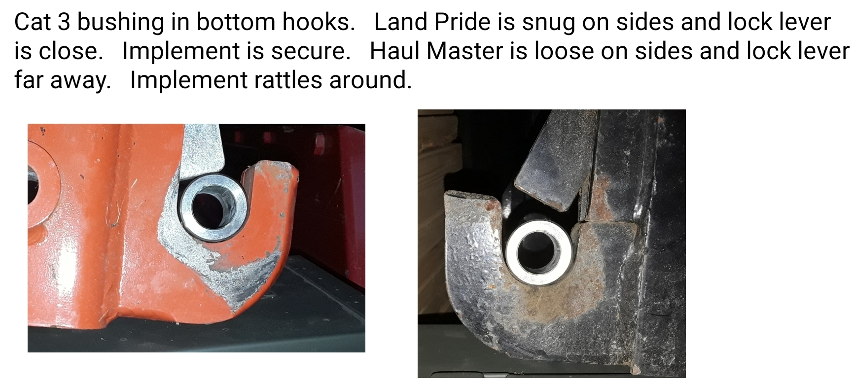 After using both the Land Pride is snug and holds an implement such as a rototiller steady. The Haul Master is very sloppy and an implement jumps around.