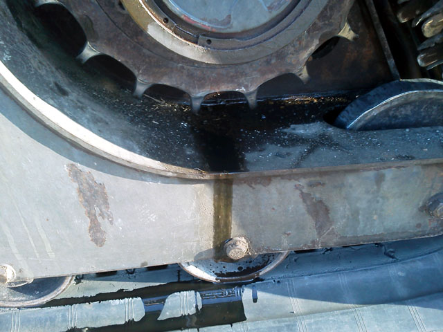It wasn't leaking when I bought it or after using it the first time. It's gear oil coming from the floating seal between the final drive and hydraulic drive motor. The Case Construction dealer and regional service rep have informed me that it's not serviceable by them. At between 6 and 7K for them to replace it, I'm searching other options. I found the correct rebuilt Case / Bonfiglioli finals available from a company in Oklahoma for a little over 3 grand, so I may do it myself. I do have an incident number with Case customer service so we'll see what happens on that end.