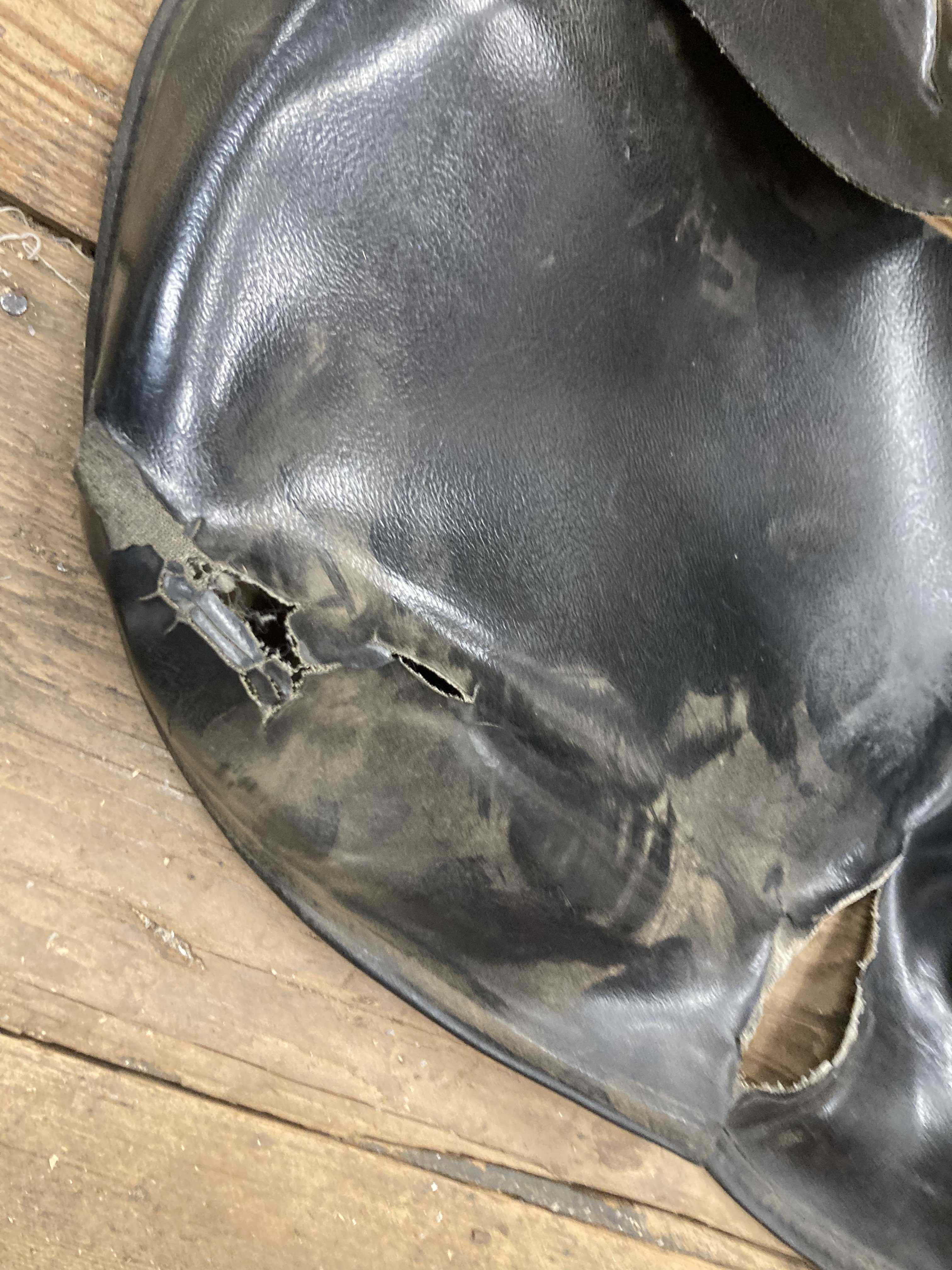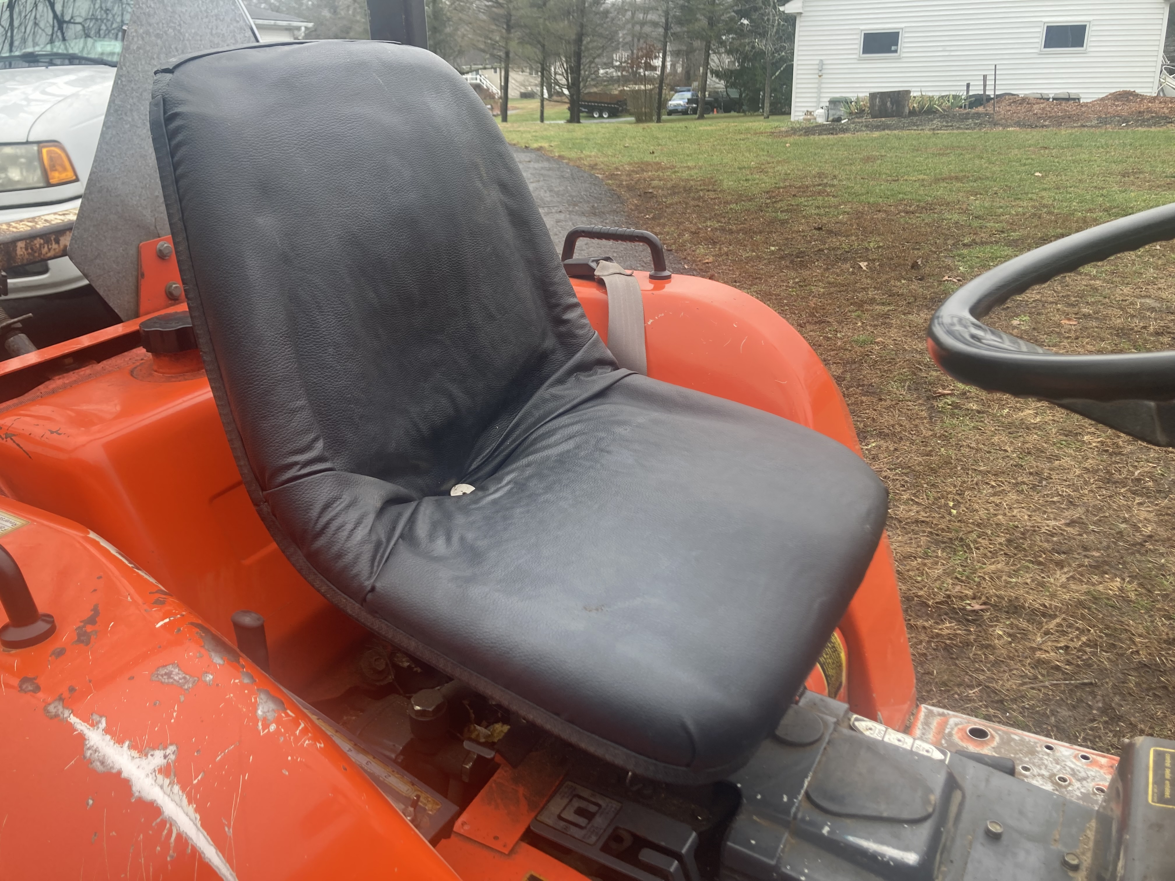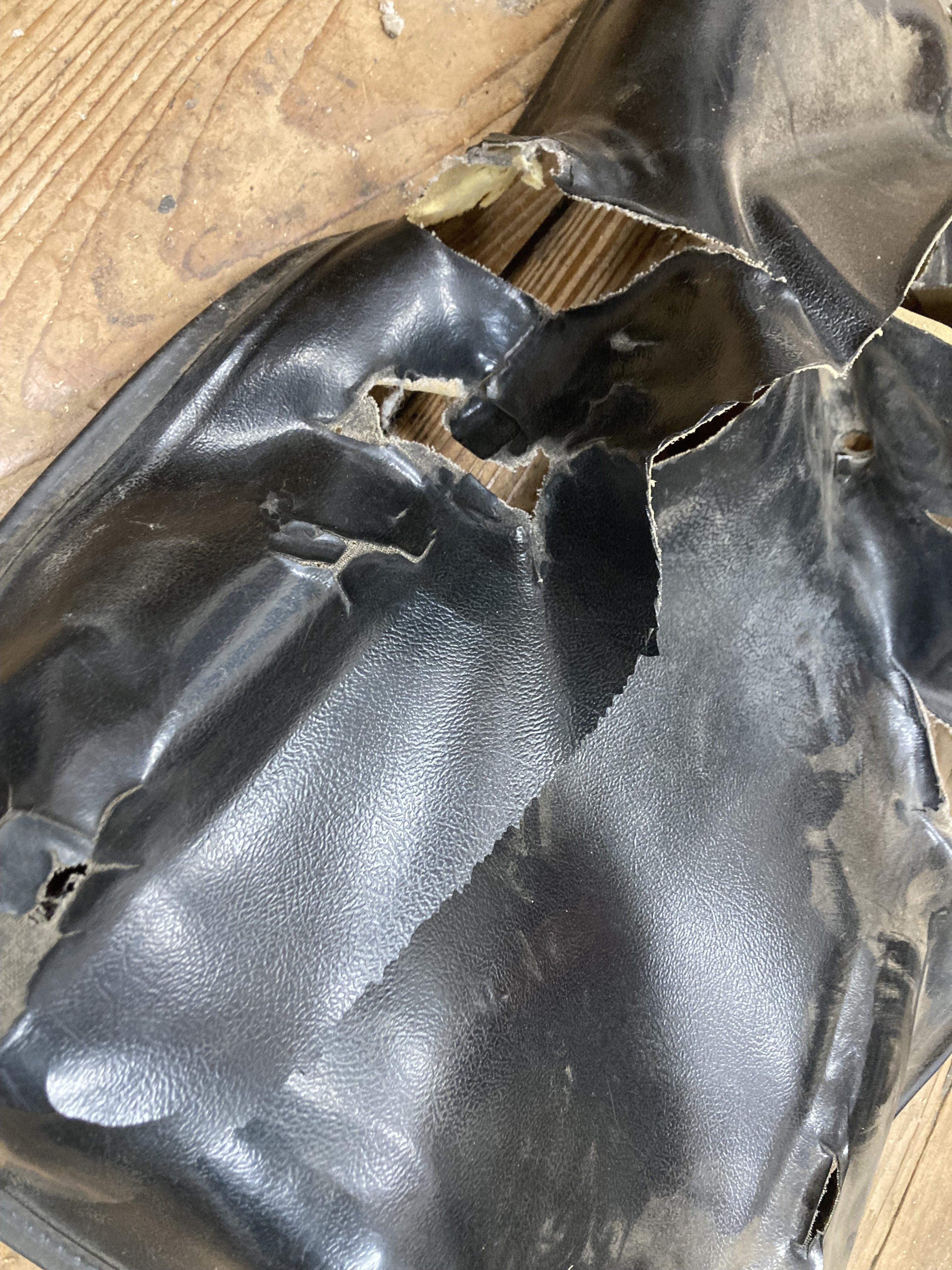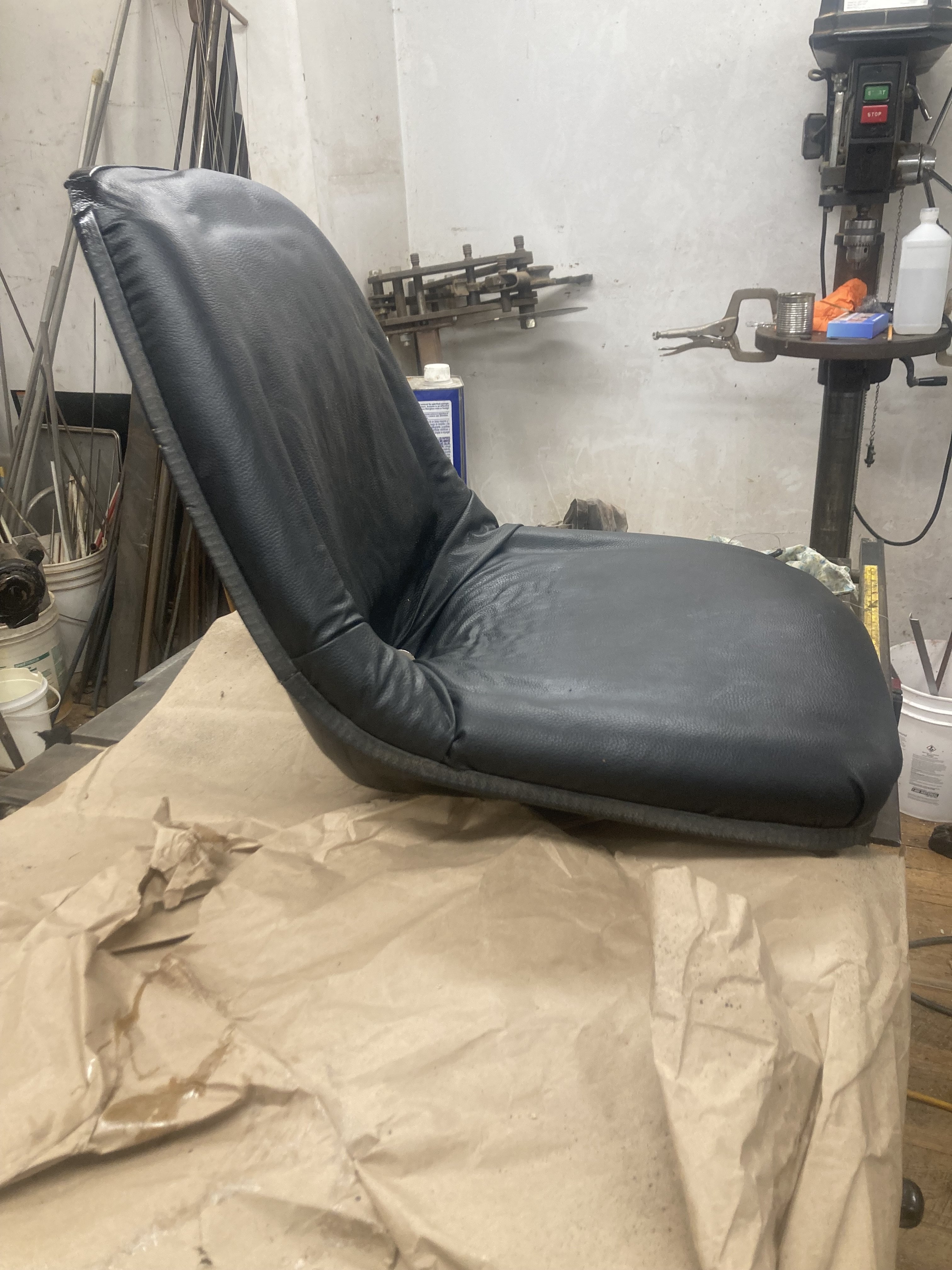 I was very proud of this, and then I started to feel a little disappointed it didn’t come out perfect. Previously when I checked to see how much this cost I kept seeing “$300“ (“ no WAY a guy gonna pay $300 for a tractor seat !) Just now after I finished it, I looked the price was $141 on Amazonwhich is kind of doable. I bought the vinyl for 20 bucks so I saved $121. Happy about that. All the other materials I had on hand from previous projects, contact adhesive spray adhesive. The old seat was very badly deteriorated and had been that way for quite a while so even some of the foam rubber under the new vinyl head disintegrated from UV exposure. It wasn’t easy.