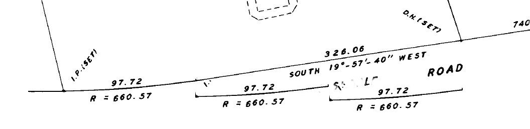 I don't remember ever having seen a surveyor's drawing that showed courses to the minute of a degree (60ths) and the distances to hundredths of a foot and were off so much as this drawing would be if the 326 includes the 97 without a note to that effect. And I am confident that I have never seen on a survey a distance that was the sum of a straight-line distance and an arc distance. Admittedly, the scale that shows up above makes it look like the 326' straight line is not long enough in proportion to the 97', so something is off. What is off is not clear to me.