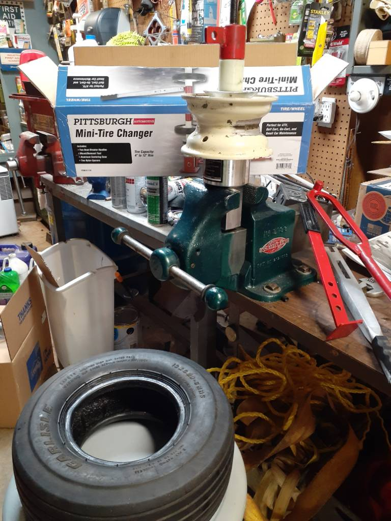 I had a flat on my Cub RZT50 on the front and thought here I go again, fighting with it for hours. The last small tire I took to a shop and they had a tool similar to this one from Harbor Freight. Instead of using the base you mount to the workbench I clamped it in a vice. I used a little dish detergent on tire rim.