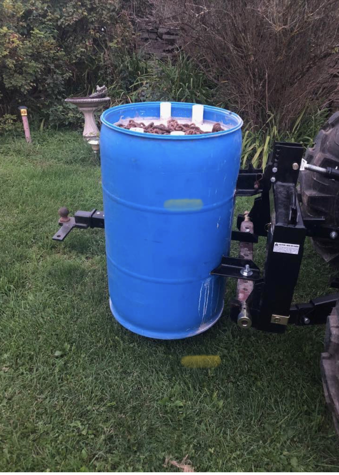 I've been thinking of making a rear ballast box for my MX5800. I'd like something relatively small / maneuverable but not too small. I was thinking a 55 gal. drum filled w/ concrete. I could stick a few 2" & 4" PVC pipes in there to hold misc. shovels, rakes, etc. & a chainsaw scabbard for a saw. Any idea roughly how much weight this would give me & would it make a noticeable difference on my tractor? I've got the rear tires filled already