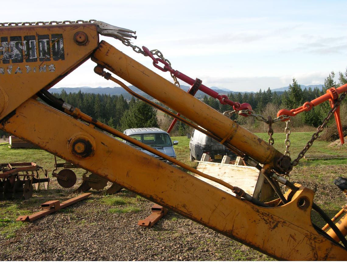 If that pin doesn't wanna move, there may still be tension on it - these things can settle and change if you're not careful, even after you've wiggled all the levers, etc - notice in the first and third pix, all the chains and binders? In this case, I was NOT rebuilding cylinders but replacing hoses. Still, the ONLY safe way I've found to do EITHER job is to first IMMOBILIZE EVERYTHING that could possibly move, THEN wiggle all levers again, several times, THEN loosen any hose fittings that could lock your target hydraulically (5-gallon bucket goes under the fittings first :=)