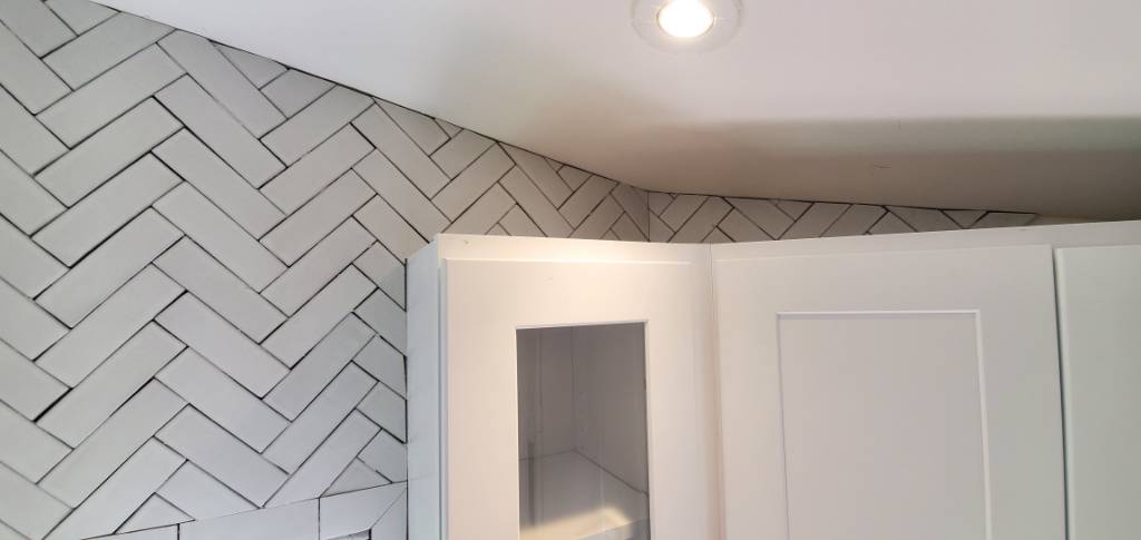 But I could probably post 5 pages about the backsplash alone. That was definitely the behemoth project for the kitchen as we chose a handmade Spanish style tile. These specifically are made in Los Angeles and are finished in matte white. We like the clean look of a white kitchen but also wanted to have the texture of these imperfect tiles ans let that along with the pattern we chose give us detail. But herringbone patterns really rely on very accurate lines and when every tile is a different size some being up to 3/8 inch longer than others it turns into a real hair pulling endeavor. Then in our kitchen, the two 45° corners and vaulted ceiling turned this into... I don't know, a nightmare?
