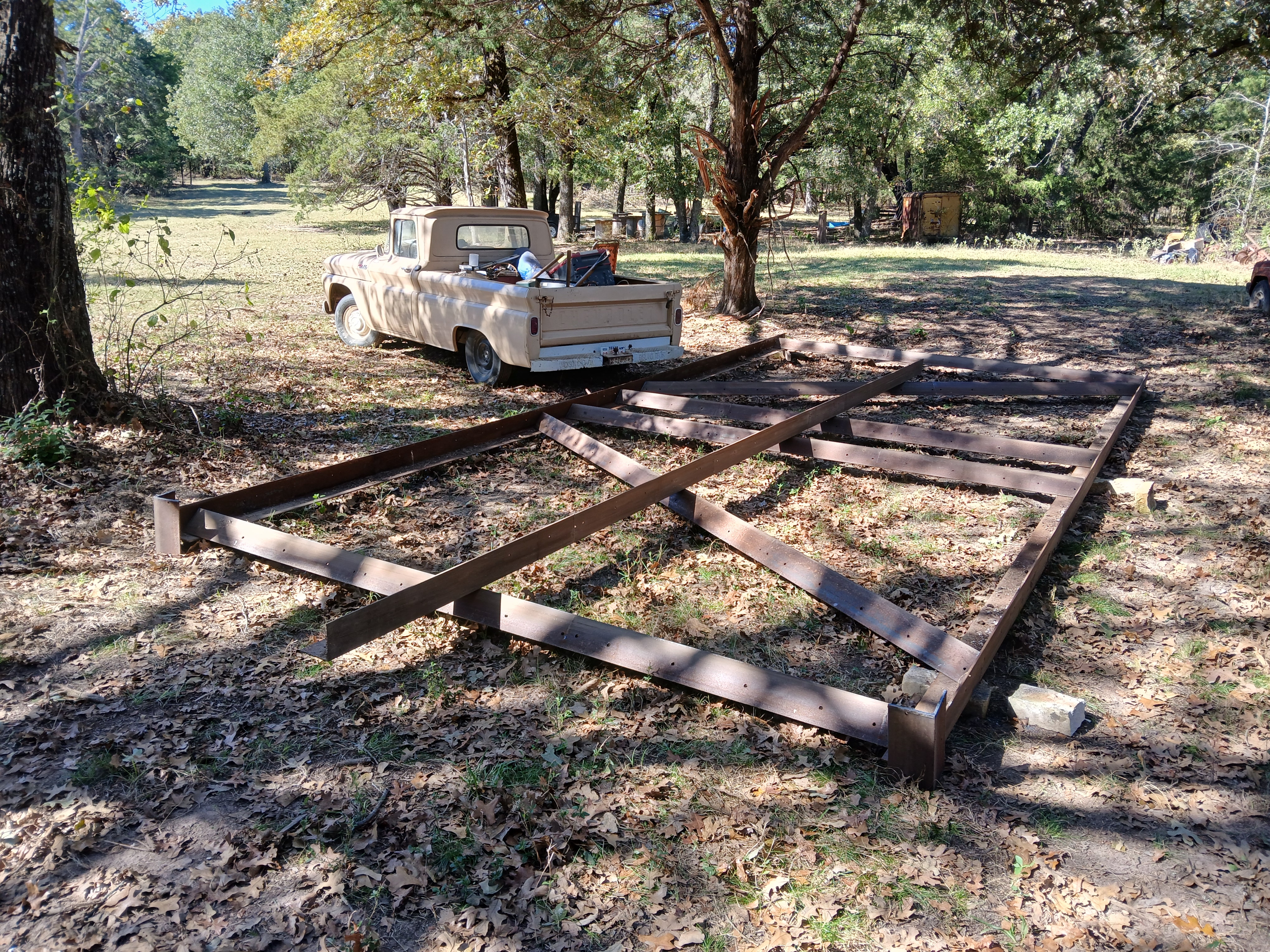 I use a single 18 foot heavy I beam. Drilled a hole about 2 feet from each end and attached chains from each side.