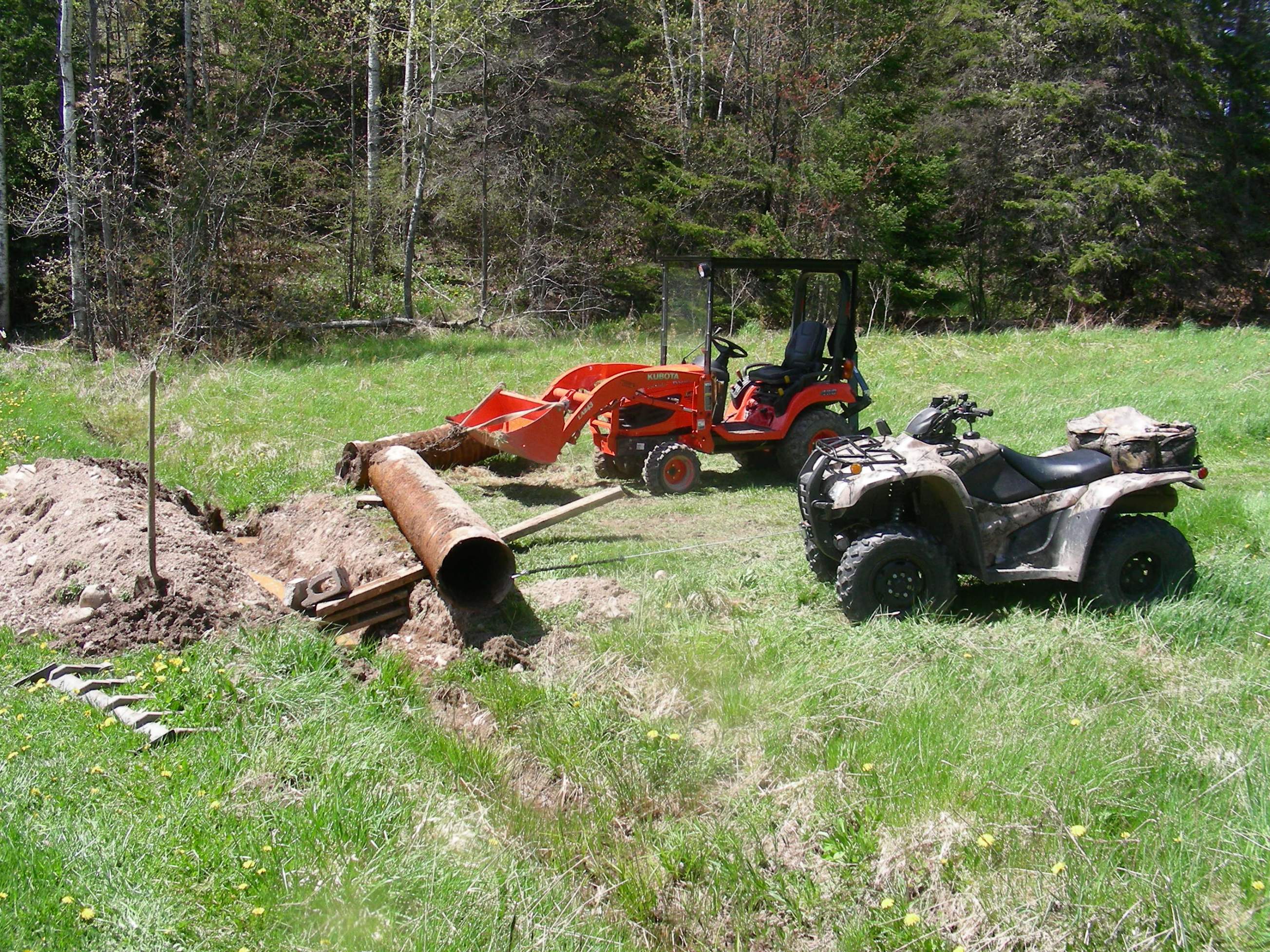 just some culvert fun I had a few years ago , the toothbar was a great help and to make it a one man job I needed the ATV as an anchor point pulling the clay filled culvert out
