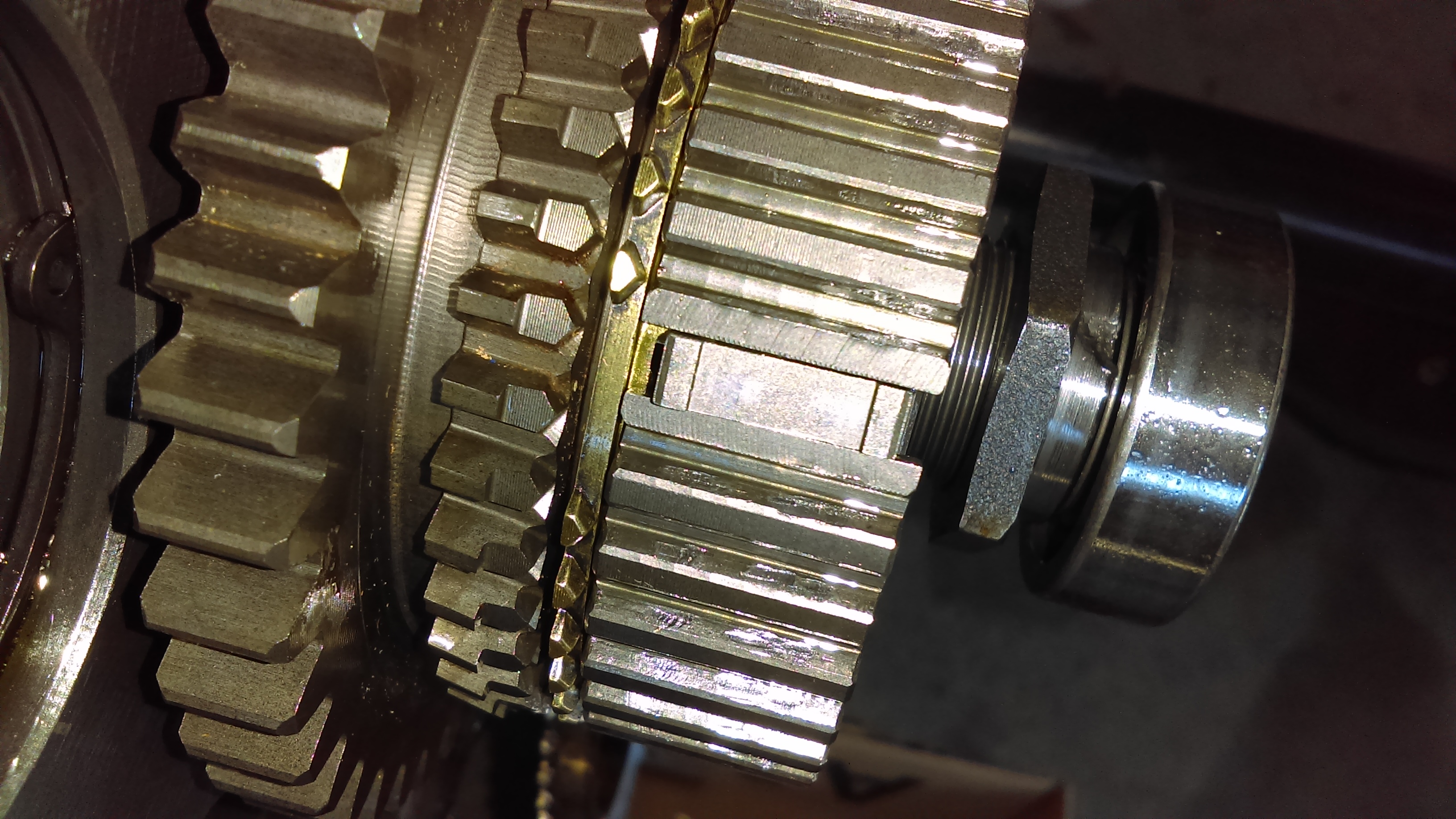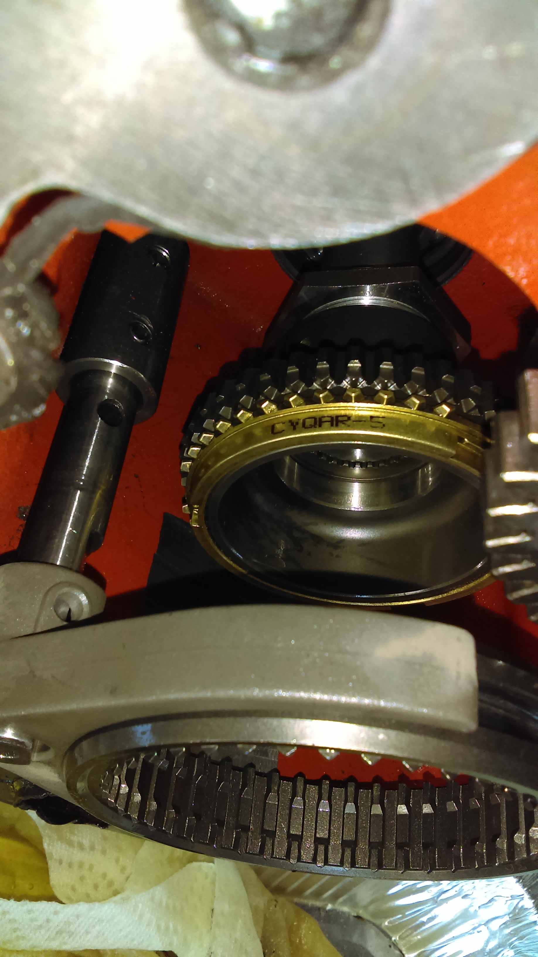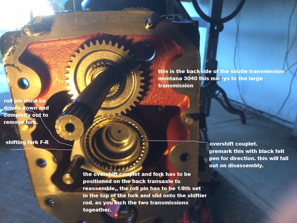 make sure when the units come apart go very slowly because the shiftier fork will hang up and the over shift couplet will fall out ((make sure)) you check orientation or premark with a black felt marker prior to disassembly for orientation. front ///back is all you worry about. 1/2 of the reverse gear is on the front shuttle and the other 1/2 of the reverse gear stays with the back tranny.The over shiftier is the only thing that couples them at full assembly. ((this has to be right at assembly)) Mine fell apart before I could mark anything but I don't see and front/back side to this overshift couplet. Here is a pto pic. I'll get better ones tomorrow.