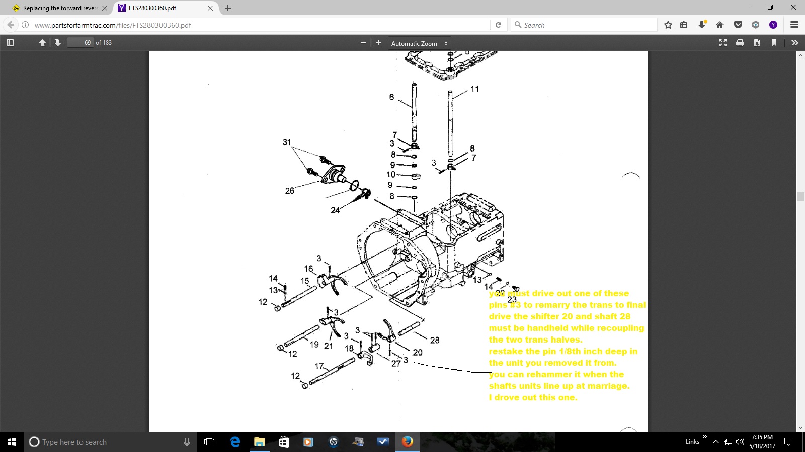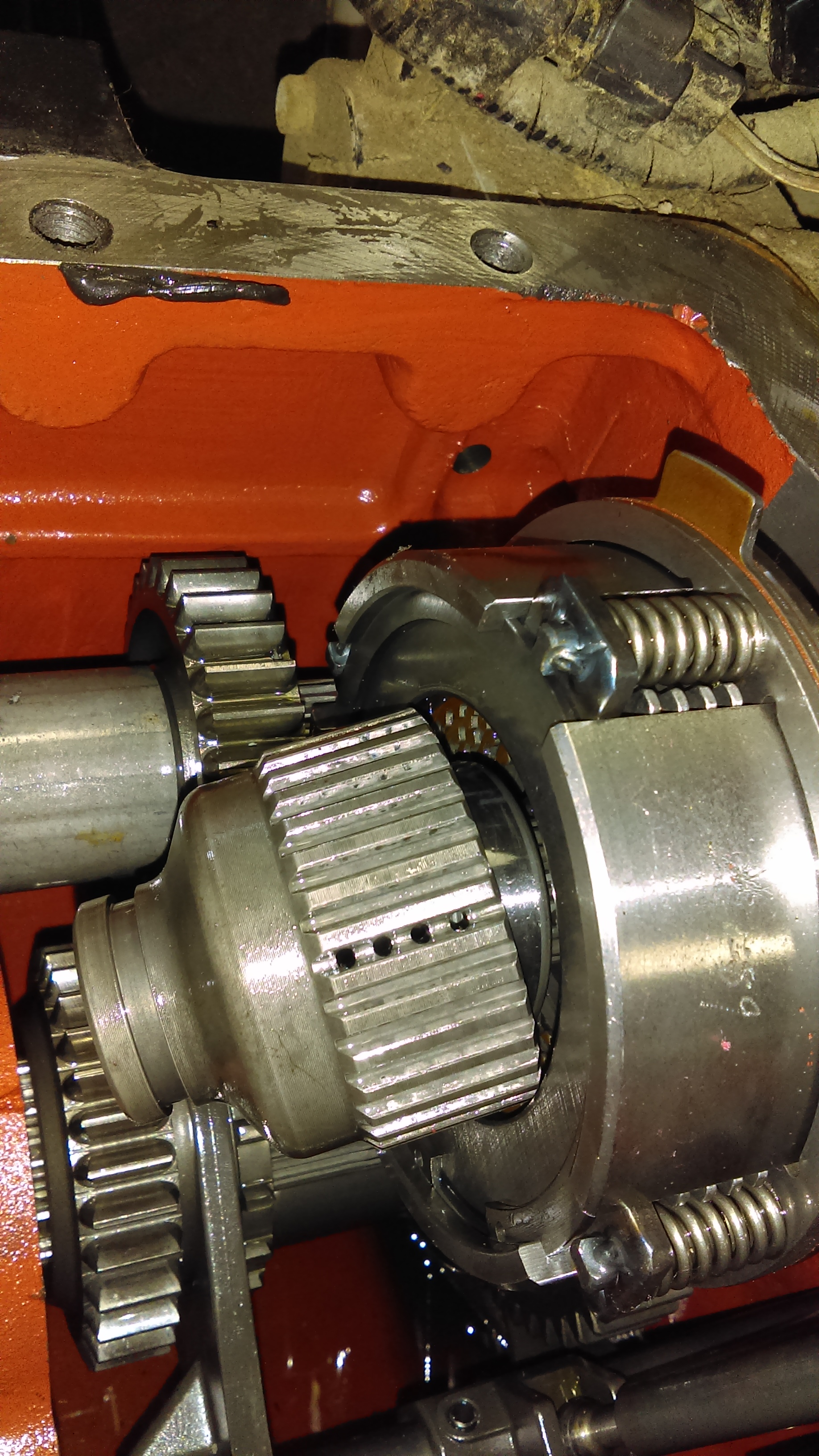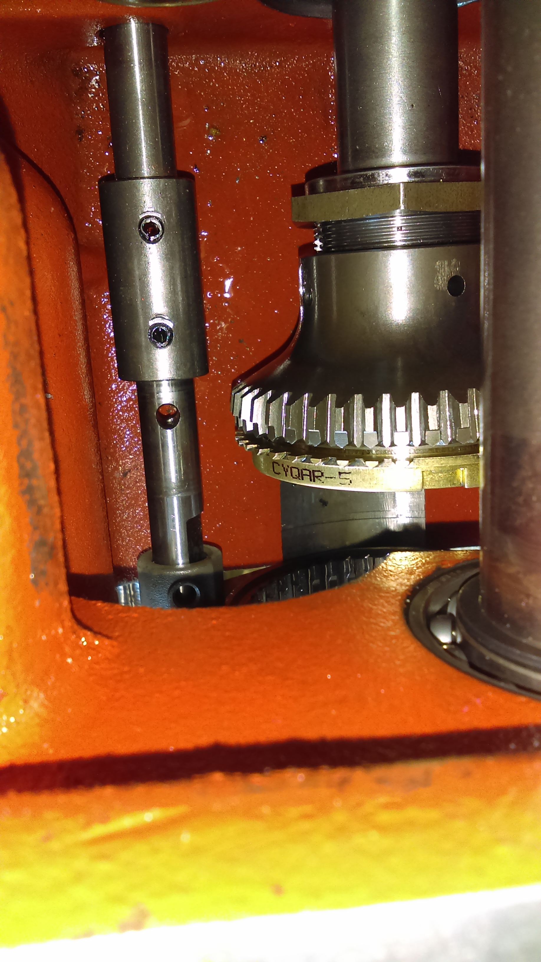 make sure when the units come apart go very slowly because the shiftier fork will hang up and the over shift couplet will fall out ((make sure)) you check orientation or premark with a black felt marker prior to disassembly for orientation. front ///back is all you worry about. 1/2 of the reverse gear is on the front shuttle and the other 1/2 of the reverse gear stays with the back tranny.The over shiftier is the only thing that couples them at full assembly. ((this has to be right at assembly)) Mine fell apart before I could mark anything but I don't see and front/back side to this overshift couplet. Here is a pto pic. I'll get better ones tomorrow.