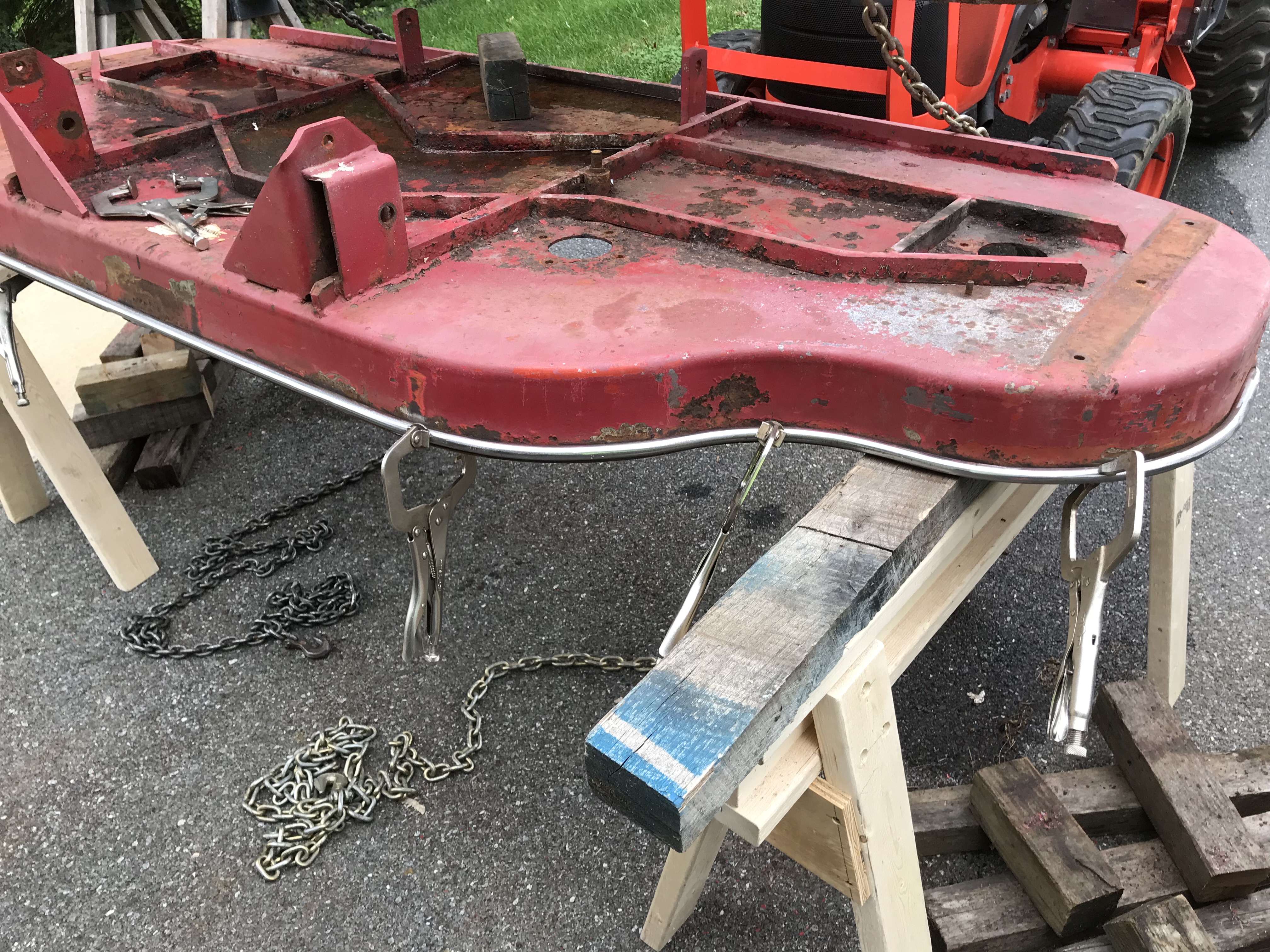 Last Fall I picked up a well-used Caroni TC910 for $600. It was ugly all over but had a good solid main deck. The baffles were in rough shape and needed to be replaced. The wheels and all the supports were still in good shape. There's no inside space that's safe to weld in at home and I thought I could get it finished before Winter set in so the project was done in the driveway. By the time all the bad metal was replaced with good metal, the season changed. Rather than haul it to the shop at work, the pieces were put on a pile till Spring.