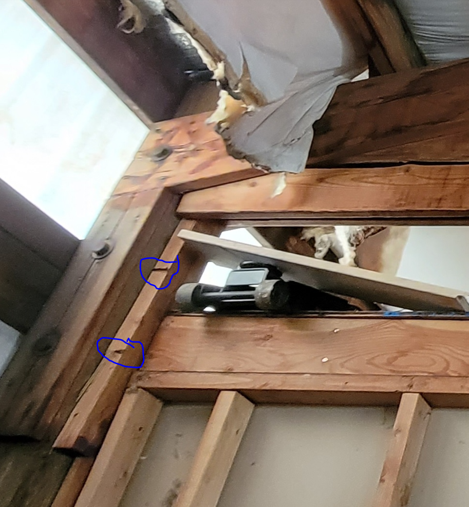 You can see the 2x6 I mentioned below the chord. It has split where it was nailed to the wall post (old nails in the two blue circles) allowing the chord to shift down.