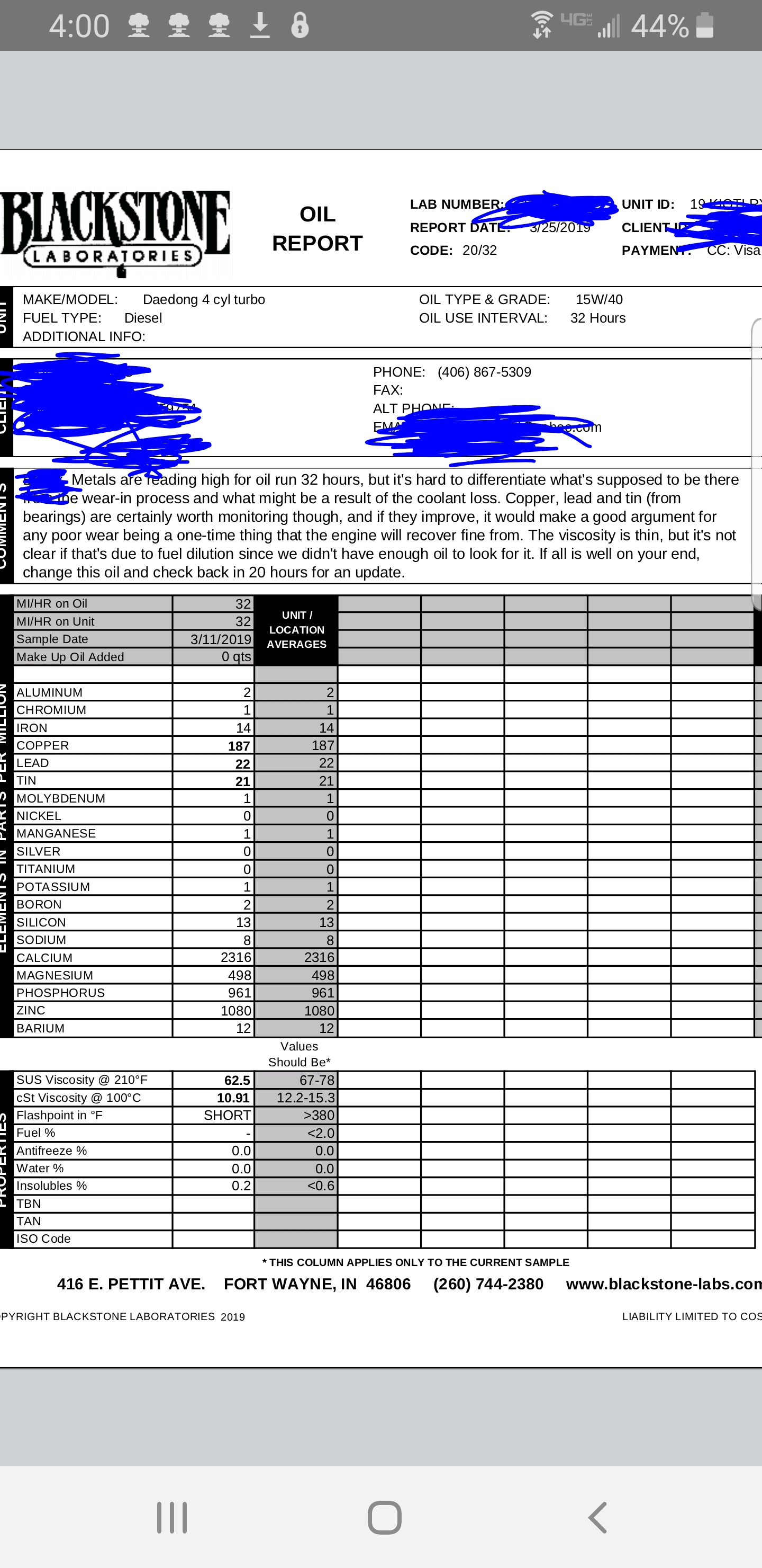 Oil report came in today. Not much help, but it did show there wasn't any coolant in the oil which is good. Im getting close to the 50 hour mark. I will change it then and put 20 more hours on the fresh oil and send it in for another test. Not sure how well the oil report will show up...its only a screenshot.