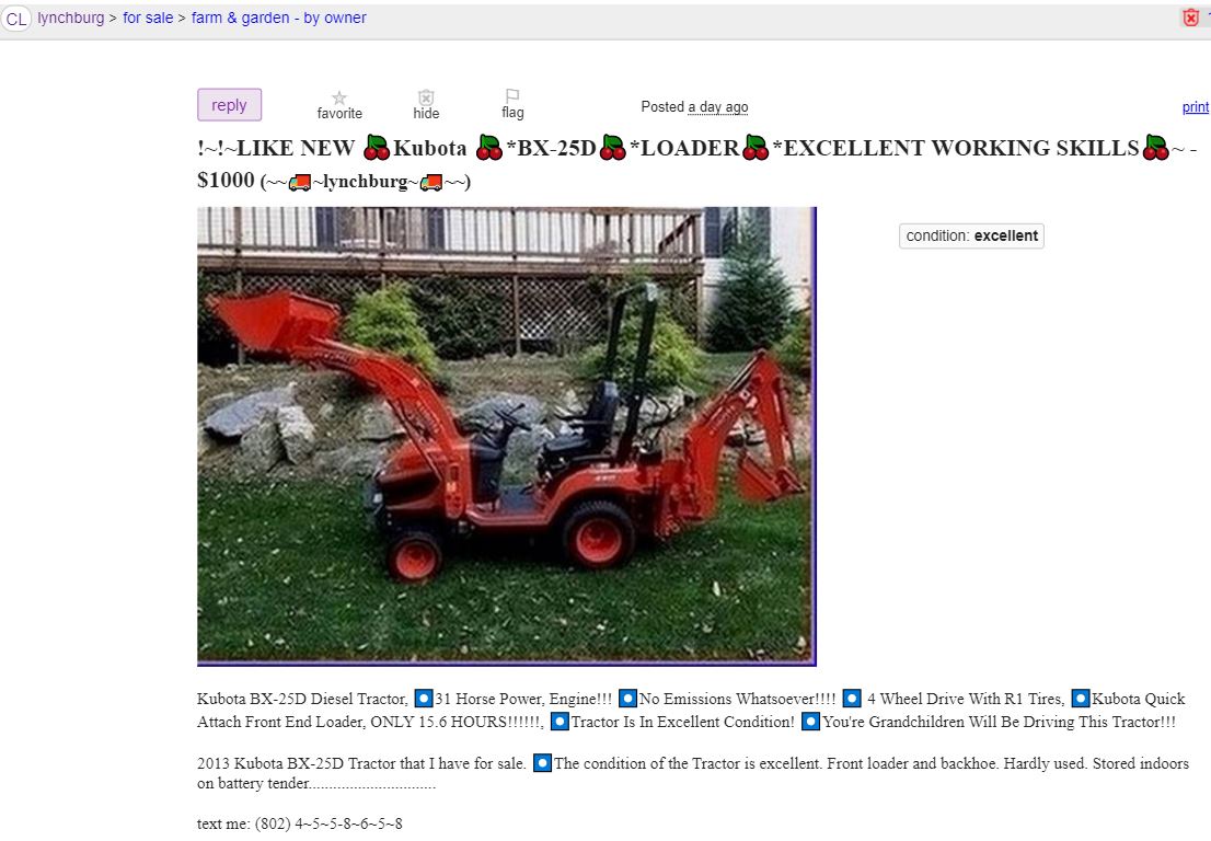 .Probably a scam but did show a phone number. The 802 area code is in Vermont. "*EXCELLENT WORKING SKILLS" is not the way people in Virginia describe their tractors.