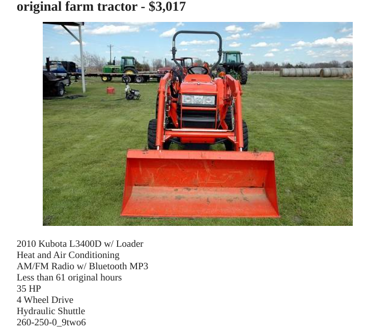 Jan 6, 2021 / Scammers are getting sloppy #1 B BeezFun Elite Member Joined Jul 1, 2009 Messages 2,521 Location IL Tractor Kubota B2710 This little beauty has heat and A/C but oops, forgot the cab: