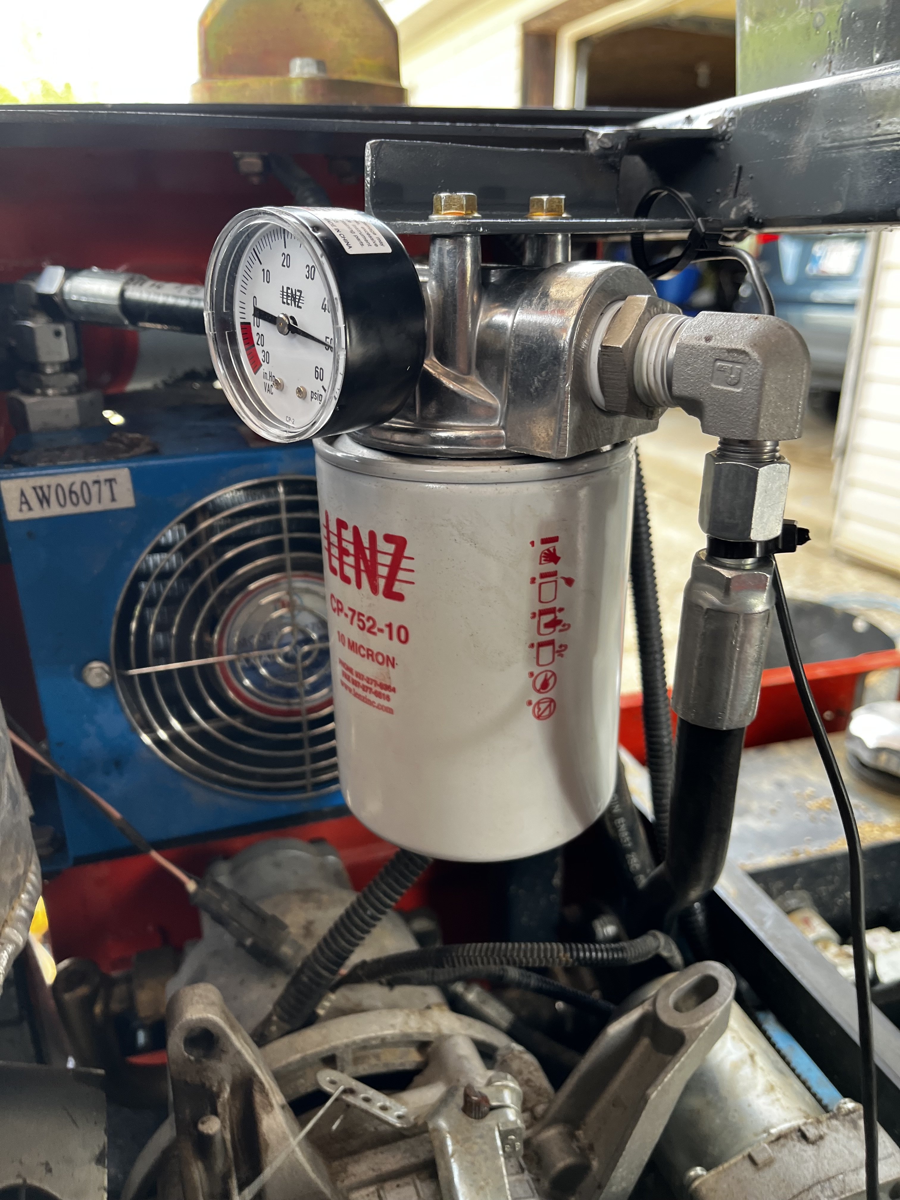 After getting the fuel tank out of the engine compartment I added this 10 micron filter to the hydraulic system. Parker hydraulics in Jeffersonville In. had all the fittings I needed and made up two hoses to my specs but were pricey.