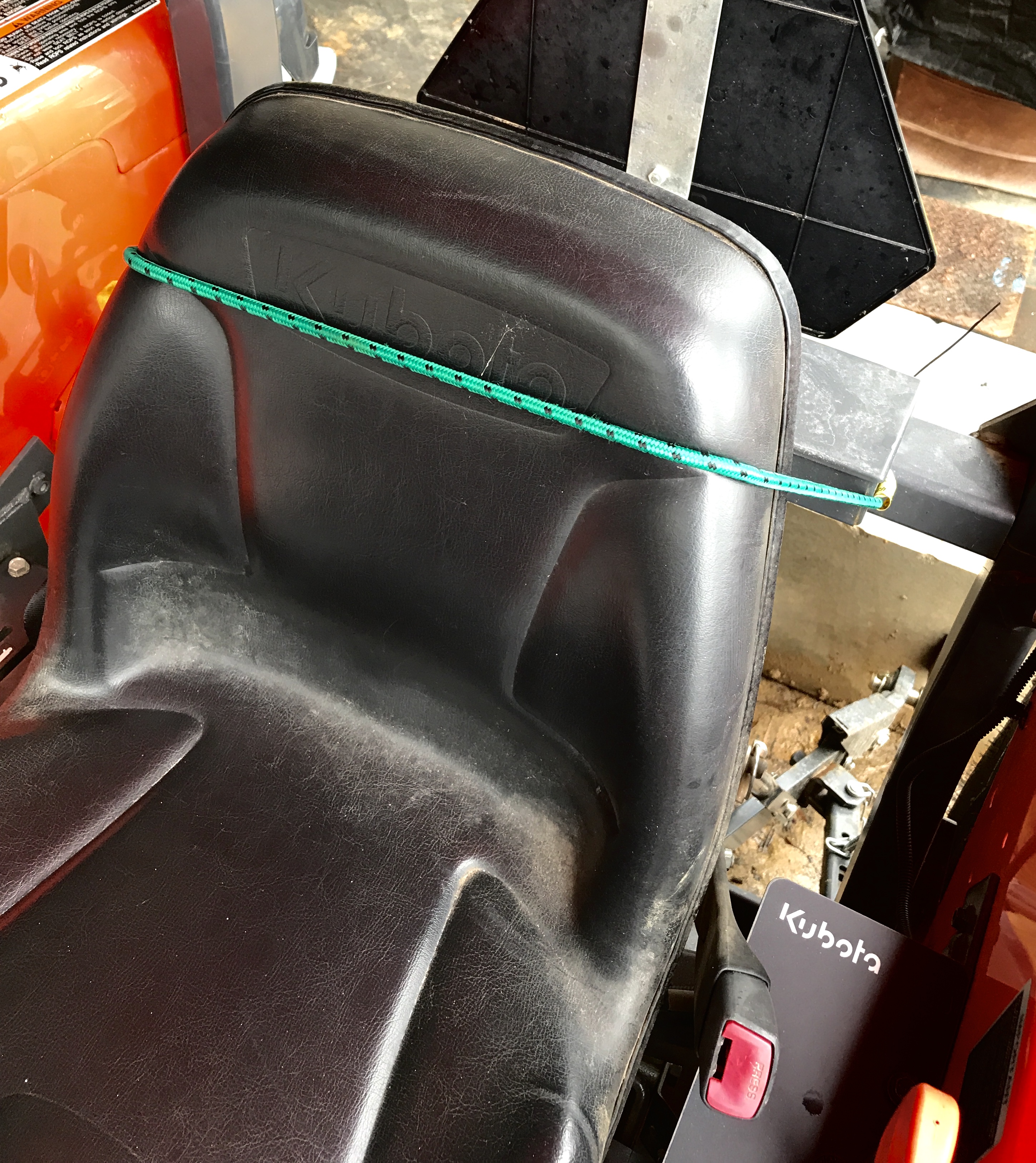 I was loath to permanently disable the safety switch, but definitely need a way to stand while using the forks and when hitching the FEL implements. Trying to press down on the seat with one knee while trying to control the hydrostatic pedal with the other foot was not fun. So, in desperation I came up with this hack and it has been working perfectly.
