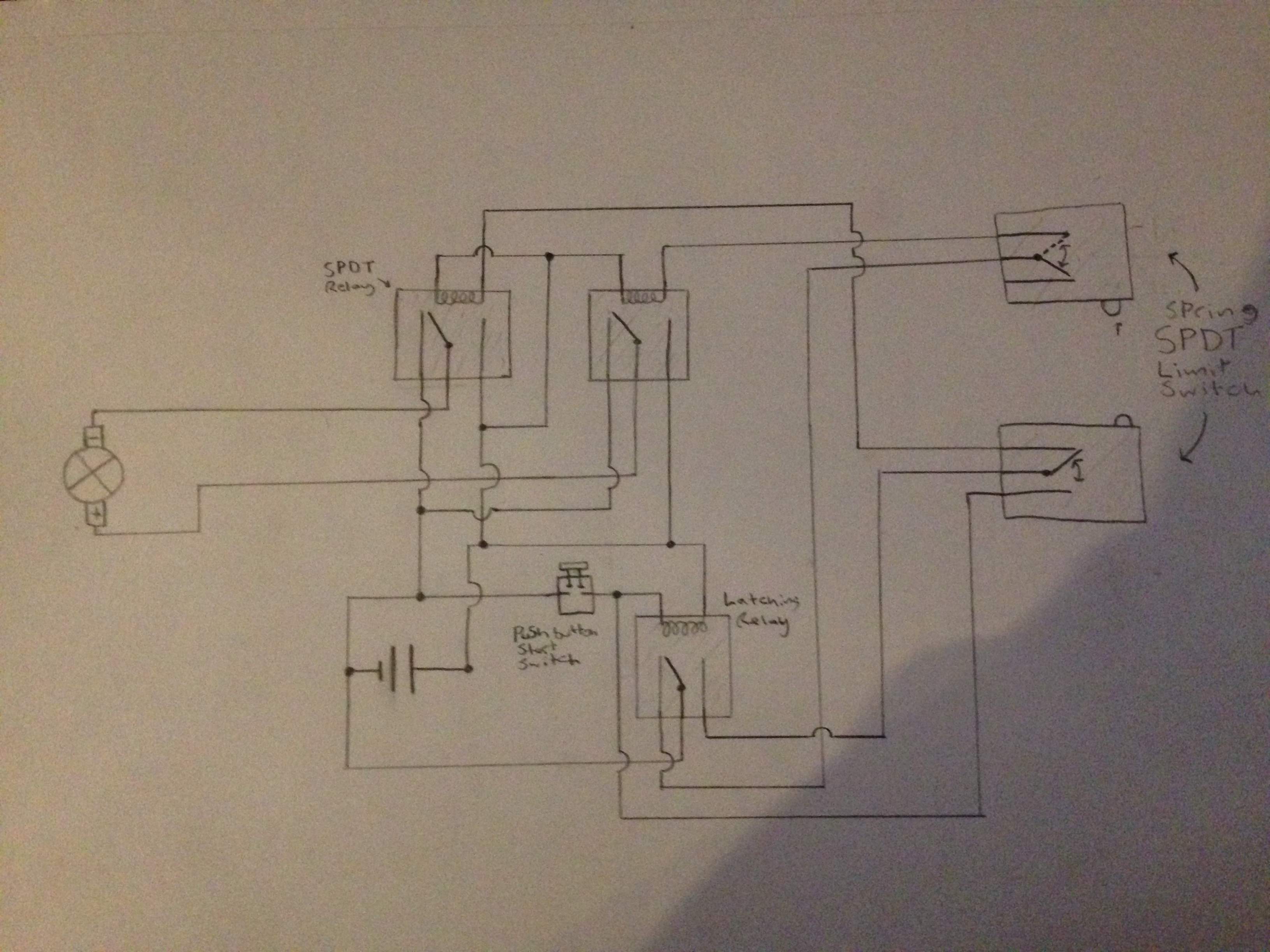 2. If I understand what you want, you want to have three switches: on, reverse, and off. Pressing the on button turns on the machine and starts it pushing. When it reaches the limit of its travel it contacts the reverse switch, which energizes the reversing relay and makes the machine pull back. When it reaches the limit in the other direction it contacts the off switch which turns the circuit off. The on and reverse switches normally open. You need a latch relay for on, a latch relay for reverse, and a DPDT relay for reverse. For the off switch you want a sPST normally closed switch, pushing it kills the power to both the on and reverse relays and stops the circuit.