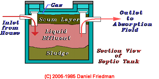 Found a decent diagram. Not fundamentally different than the first, but a bit more complex.There are baffles at the top & bottom of the tank between the inlet & outlet pipes. That should prevent scum & sludge from migrating from the inlet side to the outlet side. Unless of course you dont pump the tank occasionally then the sludge eventually makes it's way over the baffles & into the outlet pipe then plugging the leach field.