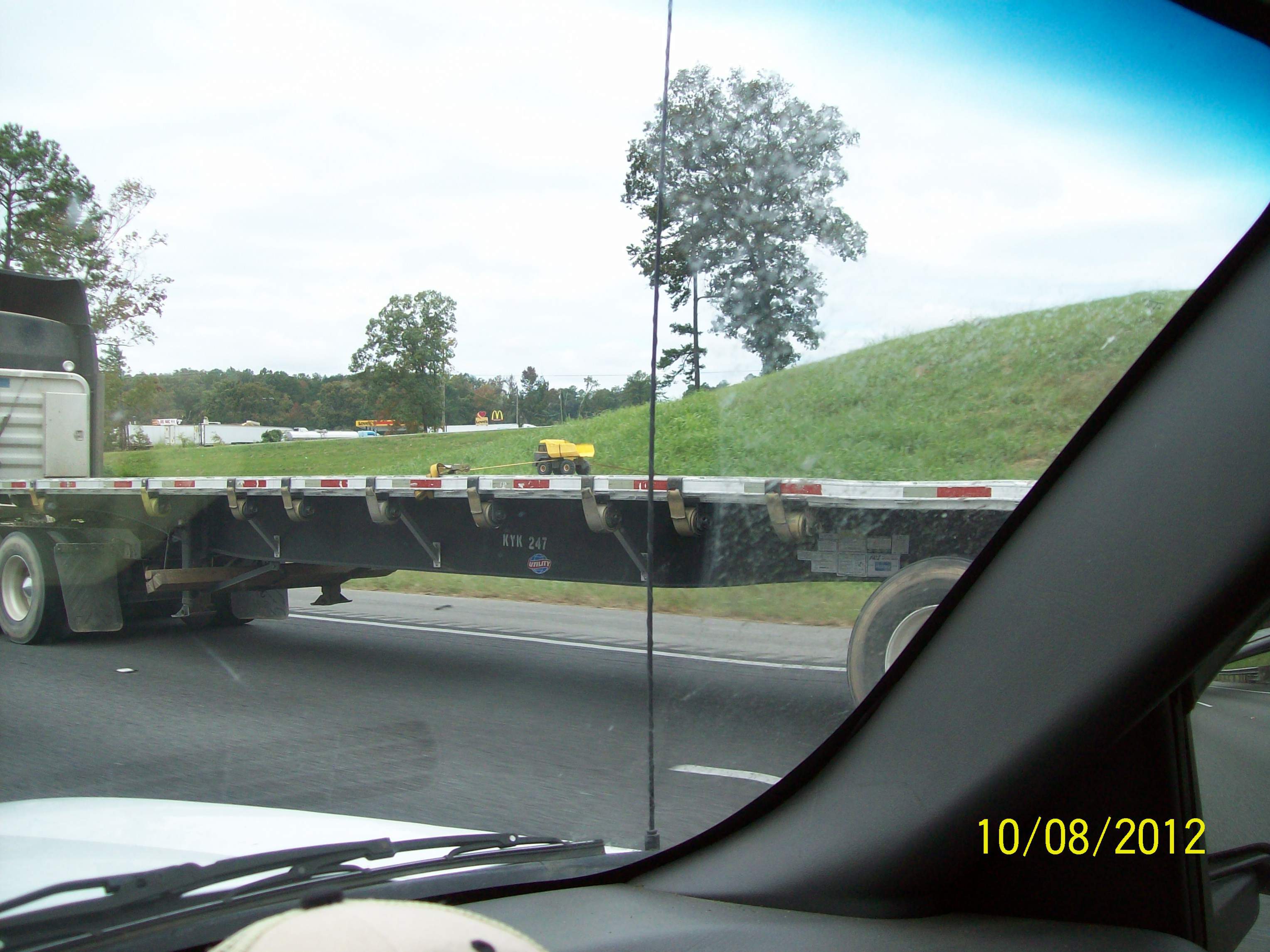 lol. That reminds me of the time I was driving from Kansas to Arkansas about 4 months ago. I was in my truck about 20 miles from Oklahoma City following a semi pulling a trailer with nothing on it but a little Tonka Dump Truck and one of those Remote control Toy Excavators. lolI so WISH that I had a picture of this. Couple years ago, near Christmas time, I passed a guy in a beautiful new crew cab dually, pulling a beautiful new (approximately) 24' 5th-wheel. Strapped to the back, with a couple of clean, new 4" straps - and I mean dead center on the trailer - was a beautiful new Fisher Price Barbie Power Wheel Jeep. Nothing else. Not a single other thing. Just that pink Barbie Jeep sitting proudly as any high dollar load, square over the trailer axles underneath a couple of pristine yellow straps.
