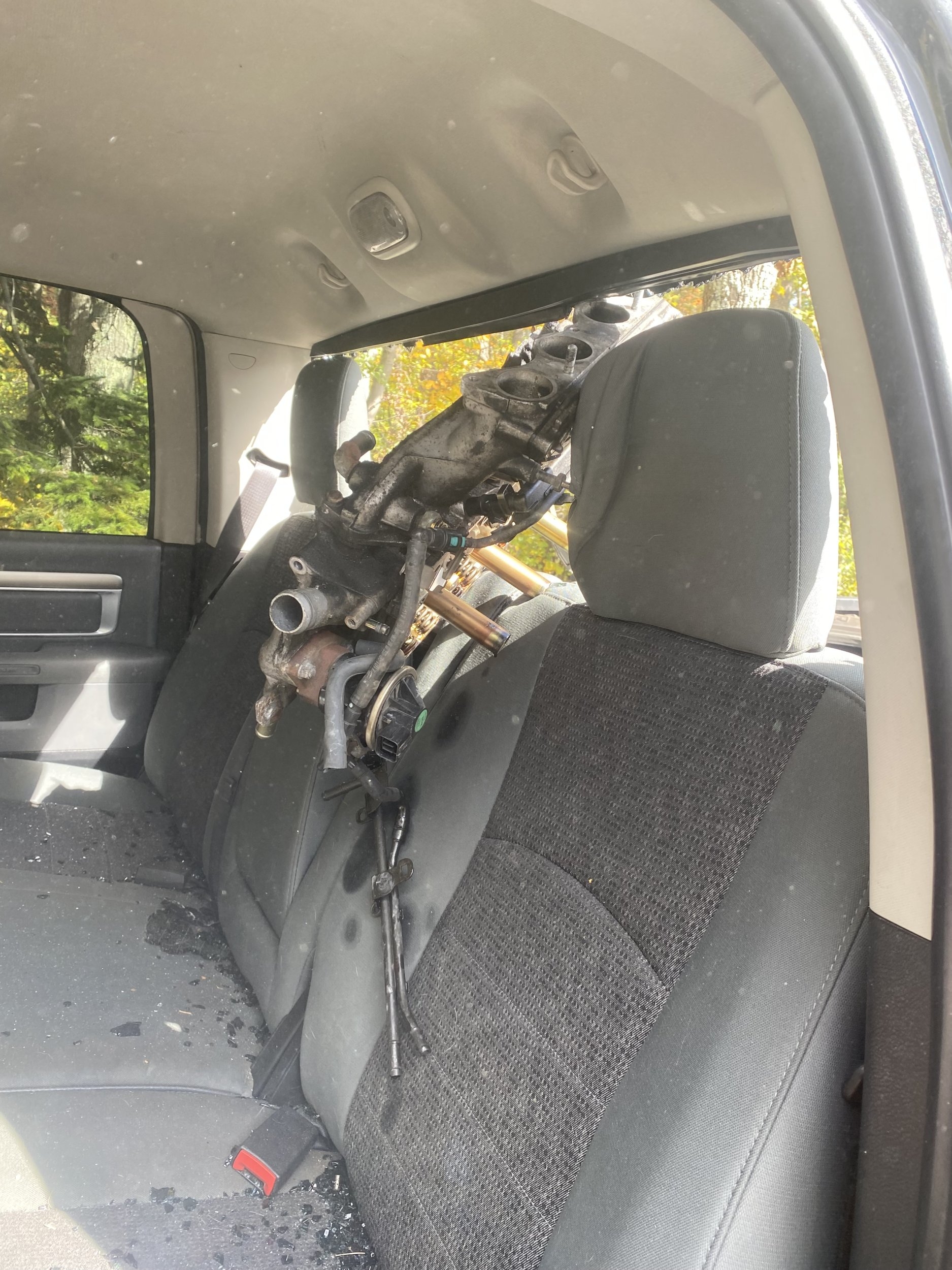 Purse went through the windshield of the sport utility, through the back window of the truck, broke the headrest on the front passenger seat, and then fell back onto the floor of the back seat.