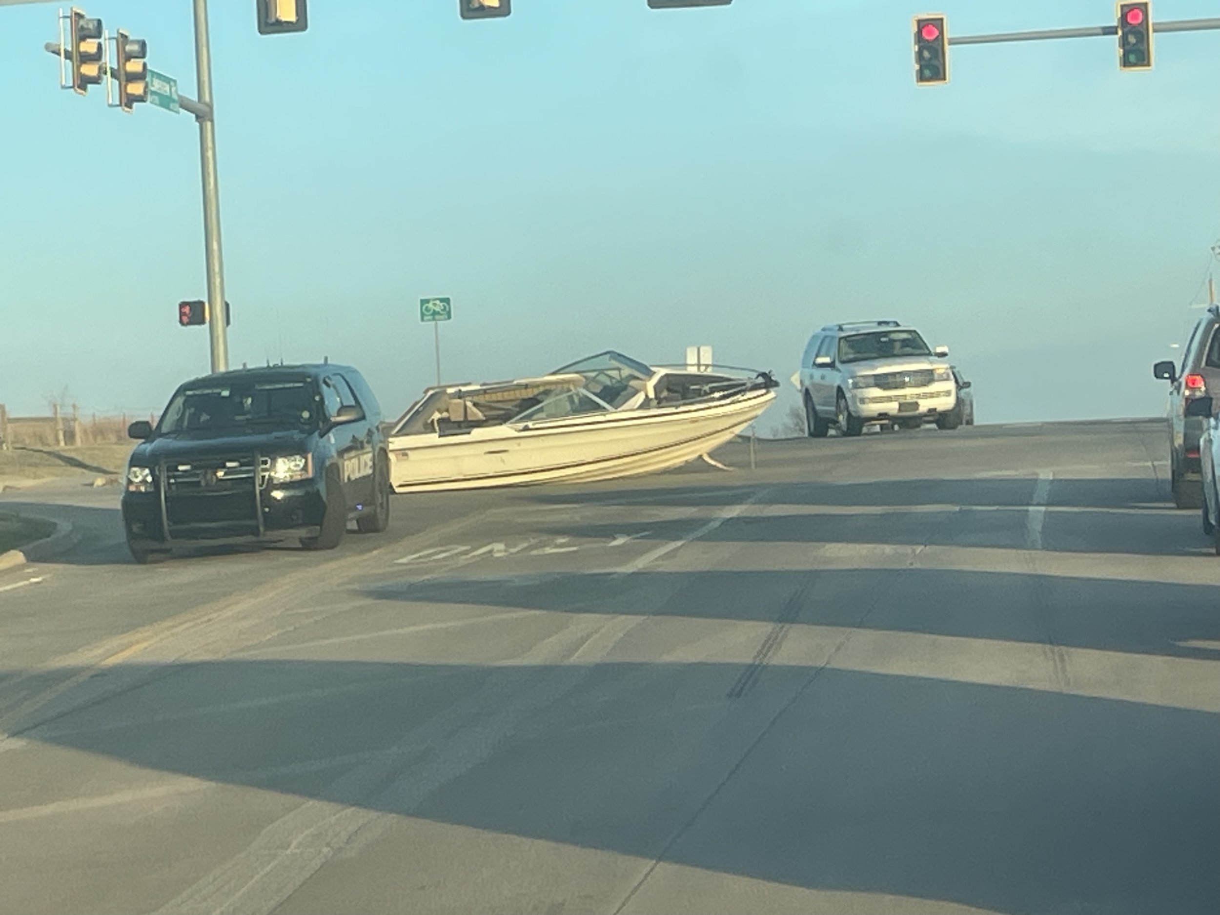 Prolly forgot his stern strap, and the winch strap was old and brittle. You can see the winch strap still dangling from the bow eye. Whether the boat slid off the back due to straight-line acceleration alone, or flew off the side of the trailer in a turn before snapping the bow strap, is anyone's guess. I've seen the latter, and in fact had my own boat once blow clean off a trailer while parked in a parking lot, right after pulling it from the water and before I had a chance to get the stern strap on.