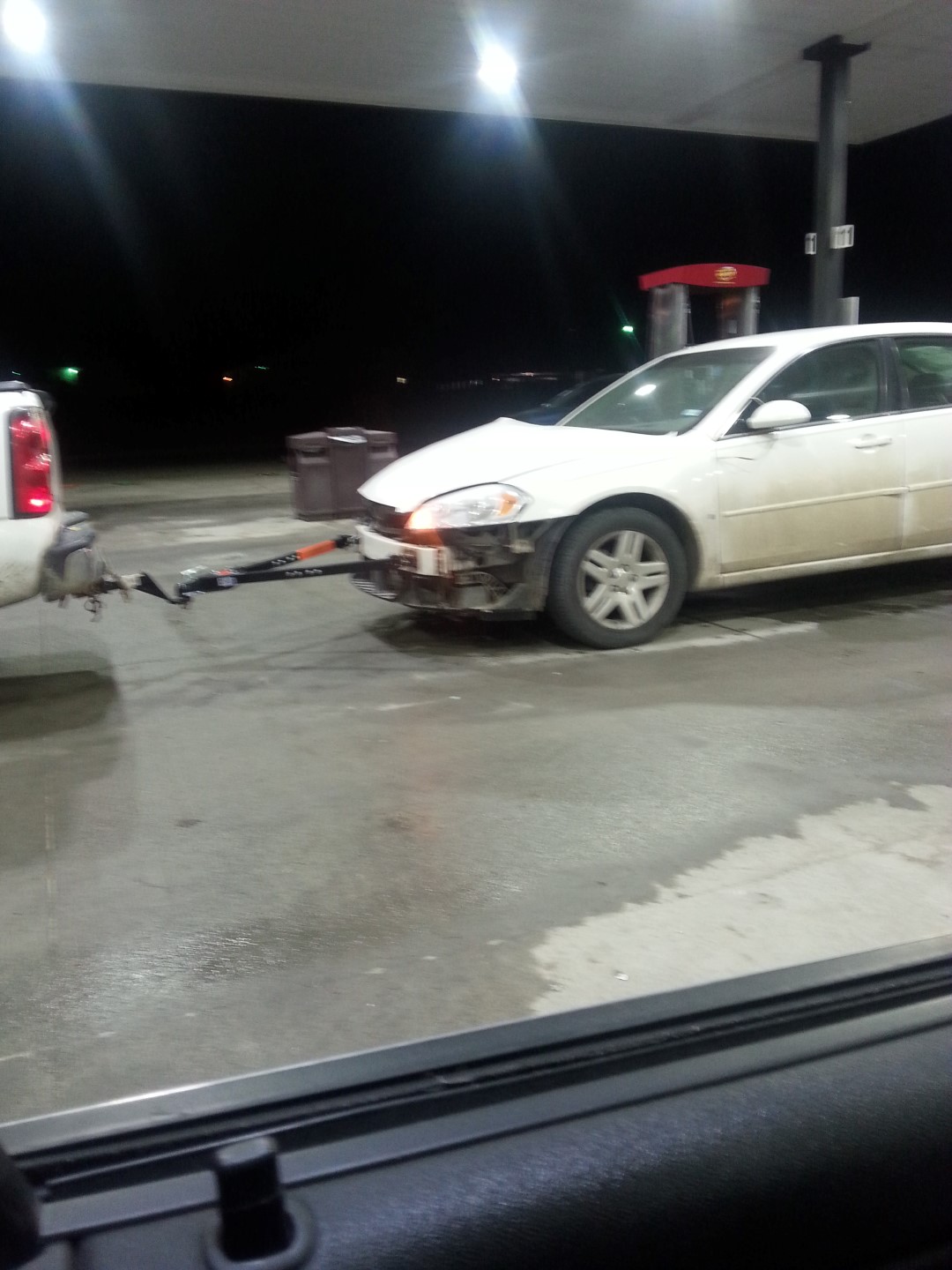 Got this one tonight about 30 miles from home. Pulled into a Casey's for gas and a coffee. The front of the truck looked like it rear-ended something and the car, too. The truck had one lug and lugnut missing on the rear driver's side wheel. The truck pulling the car didn't have license plates on it, but the car did.